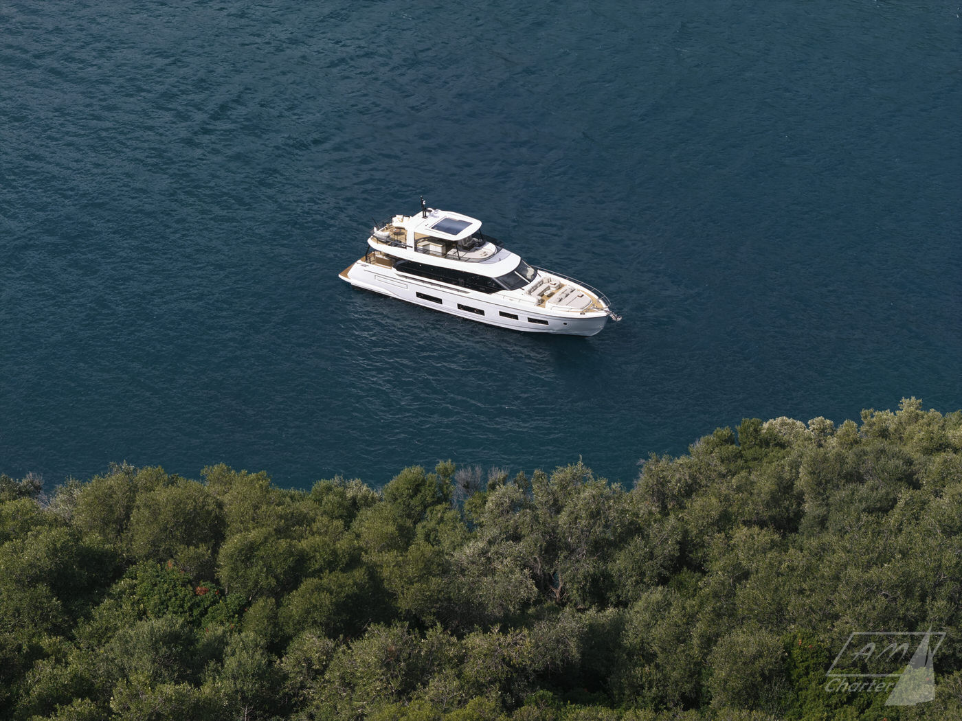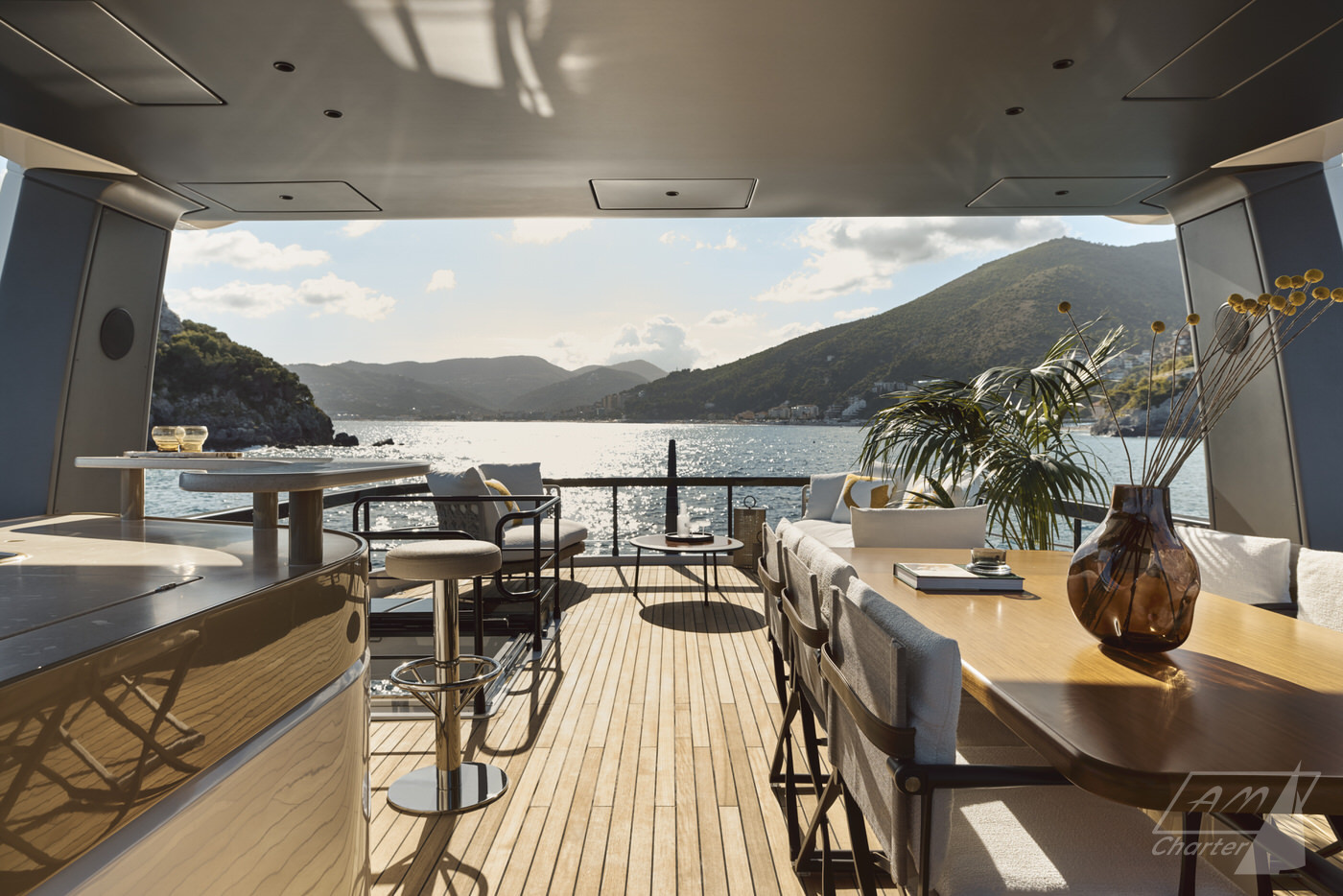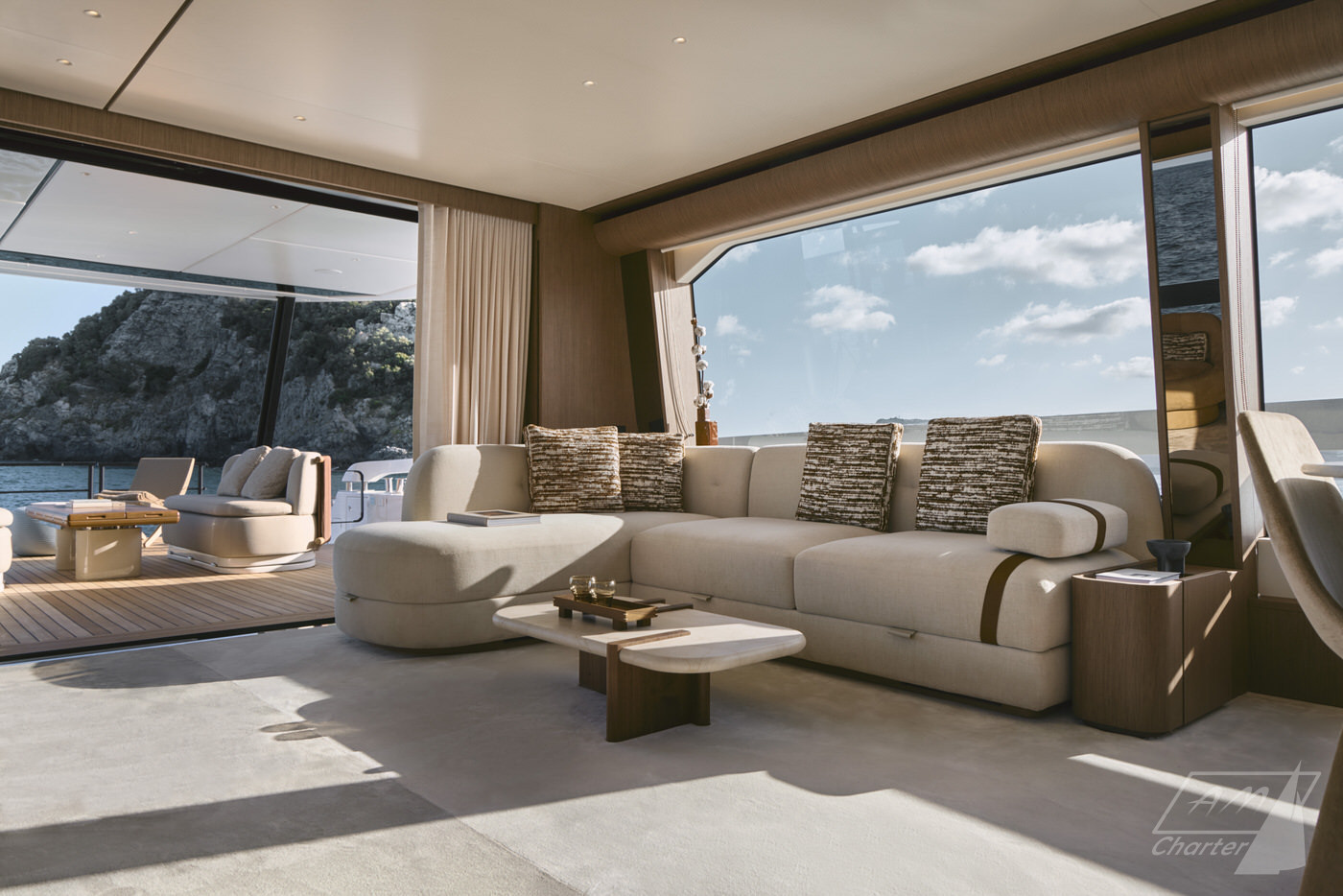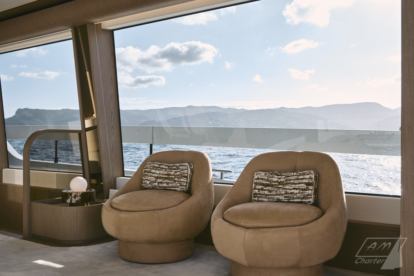 Azimut Fly 82 EXPLORA, varato nel 2025,  unisce l’eleganza e funzionalità attraverso scelte innovative di distribuzione degli spazi. Il salone è organizzato attorno a un grande tavolo da pranzo rotondo, toni caldi ed elementi dal carattere scultoreo definiscono ambienti avvolgenti e contemporanei. Offre 4 cabine per 8 ospiti (3 matrimoniali, 1 doppia). Questo modello introduce una soluzione inedita per la categoria: Deck2Deck™ Terrace, che estende il pozzetto di oltre un metro e mezzo grazie al portellone del garage ricoperto in teak che si solleva all’altezza del Main Deck. Inoltre lo yacht dispone di stabilizzatori, numerosi giochi d’acqua ed un equipaggio professionale di 4 persone.