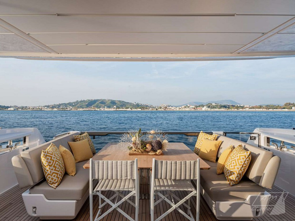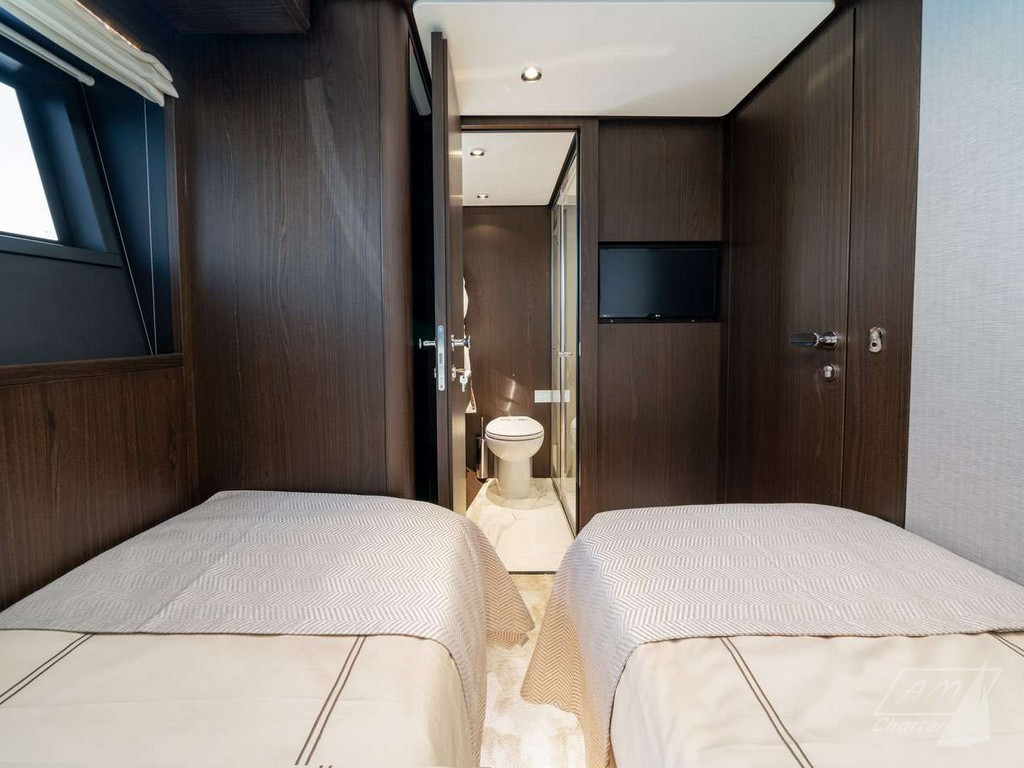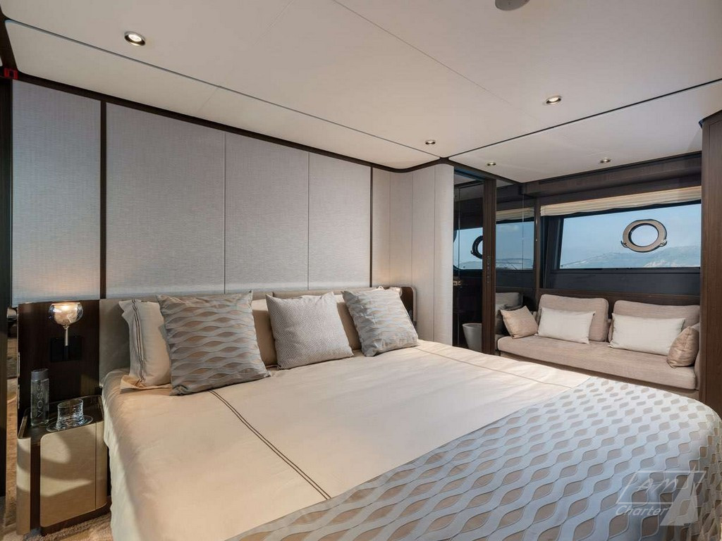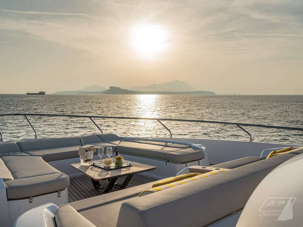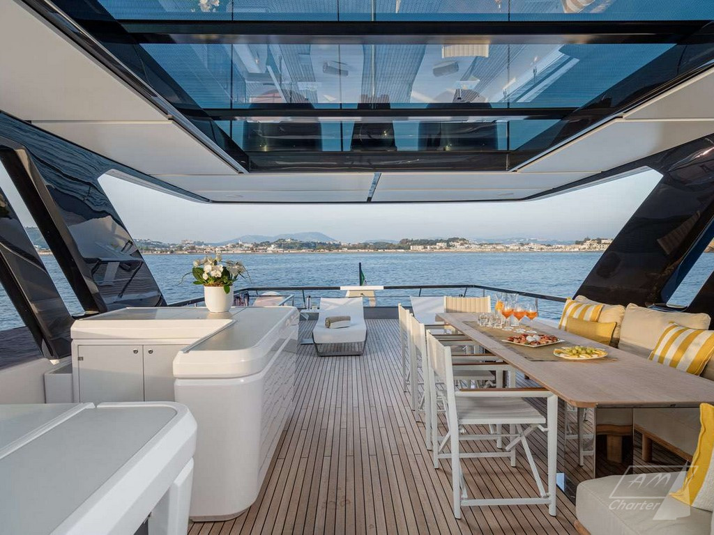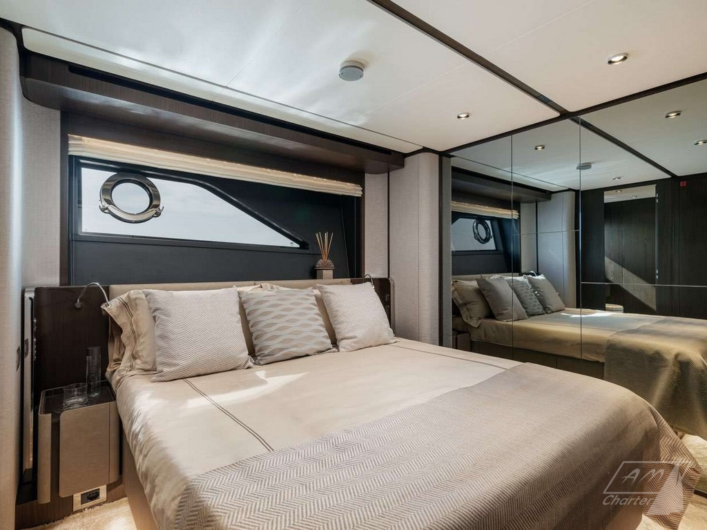 Ferretti 860 Vittoria rappresenta l’ultima nata di Ferretti Yachts. Progettata dall’Arch. Filippo Salvetti, si tratta dell’imbarcazione che più di ogni altra riesce a racchiudere in quasi 27 metri caratteristiche di spazi fino ad ora presenti in imbarcazioni ben più grandi. Gli interni freschi e contemporanei, rifiniti materiali di altissima qualità. Lo stile inconfondibile: ampie vetrate che riempiono il salone di luce. La particolare scala sinusoidale conduce al ponte inferiore dove trovano spazio 4 cabine. Una master a centro con letto king, una VIP a prua e 2 doppie a centro barca. Tutte sono dotate di bagno privato, Smart TV, aria condizionata. Le linee dello scafo sono inconfondibili e gli spazi esterni del Ferretti 860 Vittoria sono quanto di meglio si possa chiedere. Un ampio pozzetto di poppa con tavolo pranzo e ampie sedute, una zona prendisole e lounge sulla prua ed un flybridge particolarmente ampio dove trovano posto lettini prendisole, un grande tavolo ed un banco bar. Particolarmente degna di nota è la stabilità dell’imbarcazione, che è dotata sia di pinne stabilizzatrici che di stabilizzatore giroscopico.