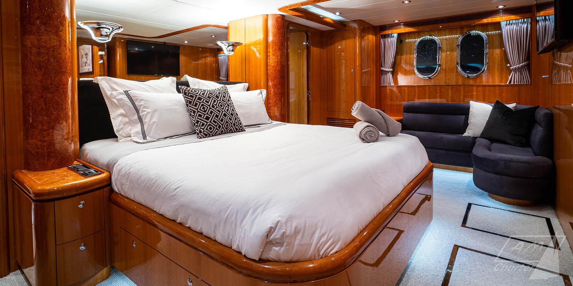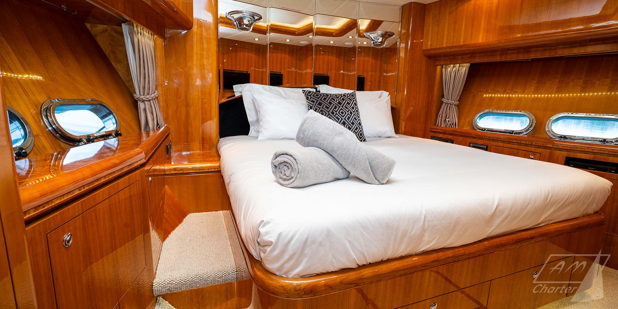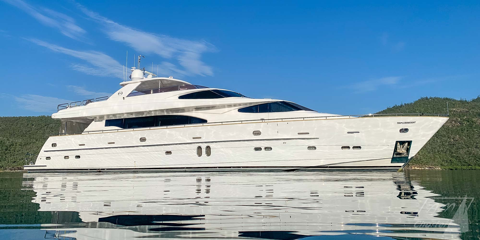 Horizon 94′ Triple888eight yacht di lusso varato nel 2008, offre sistemazione per 8 ospiti in 4 lussuose cabine: 2 matrimoniali e 2 doppie. Triple888eight ha un professionale equipaggio di 4 persone, pronto a garantire un soggiorno in mare indimenticabile. Stabilizzatori, numerosi giochi d’acqua, deck jacuzzi ed una palestra a disposizione degli ospiti durante il charter.