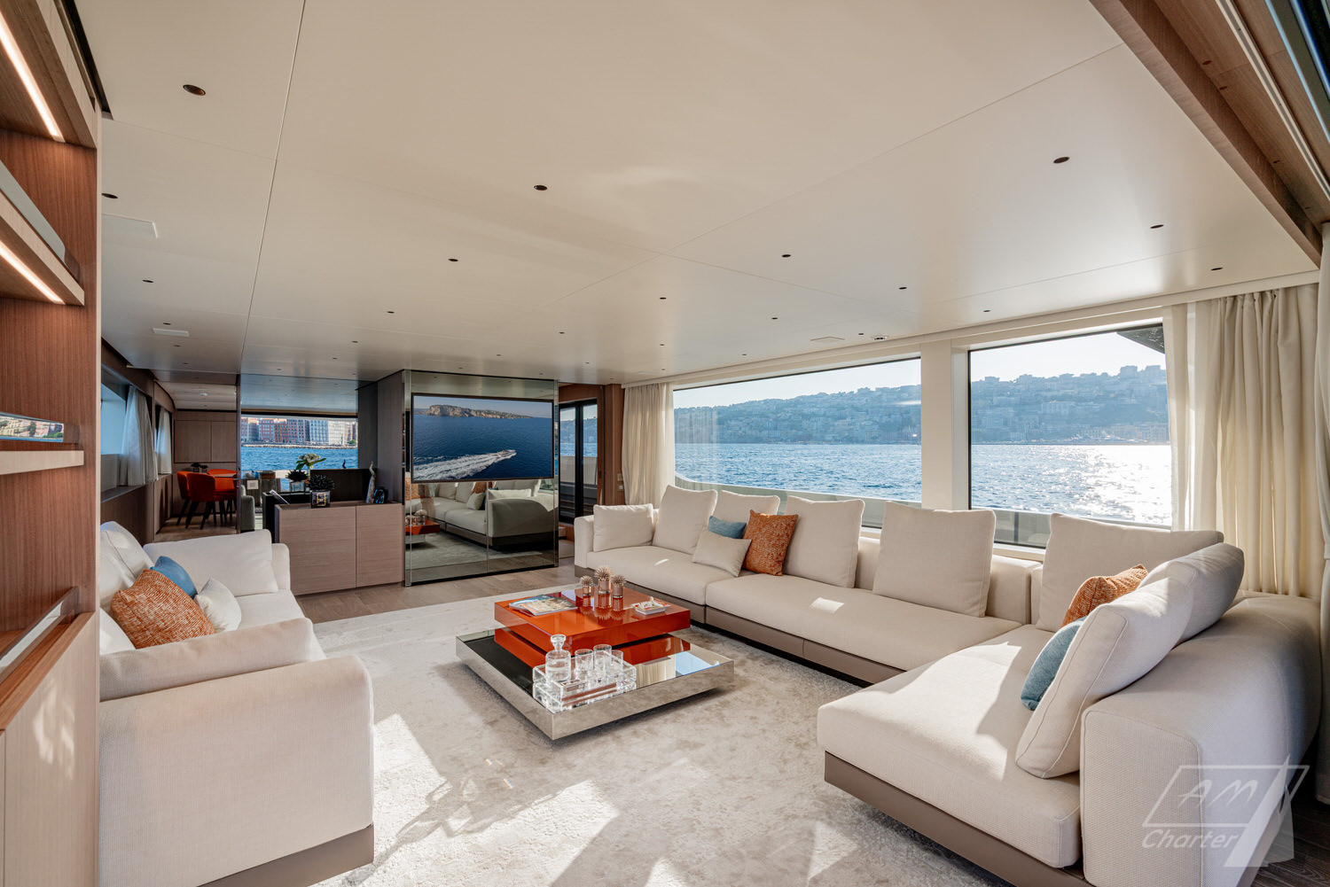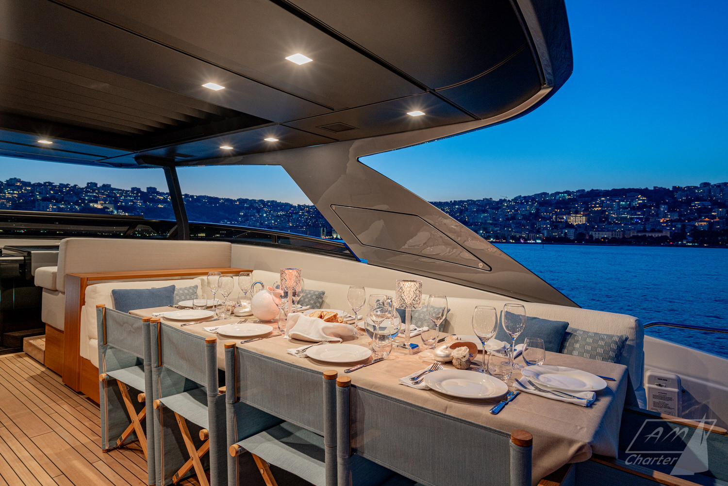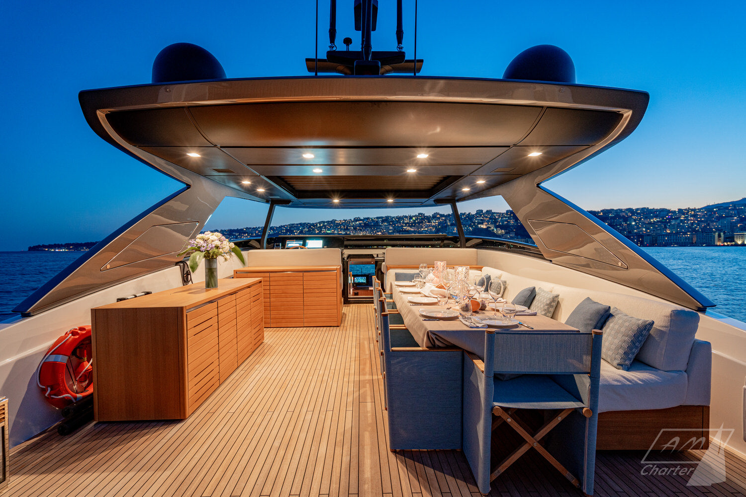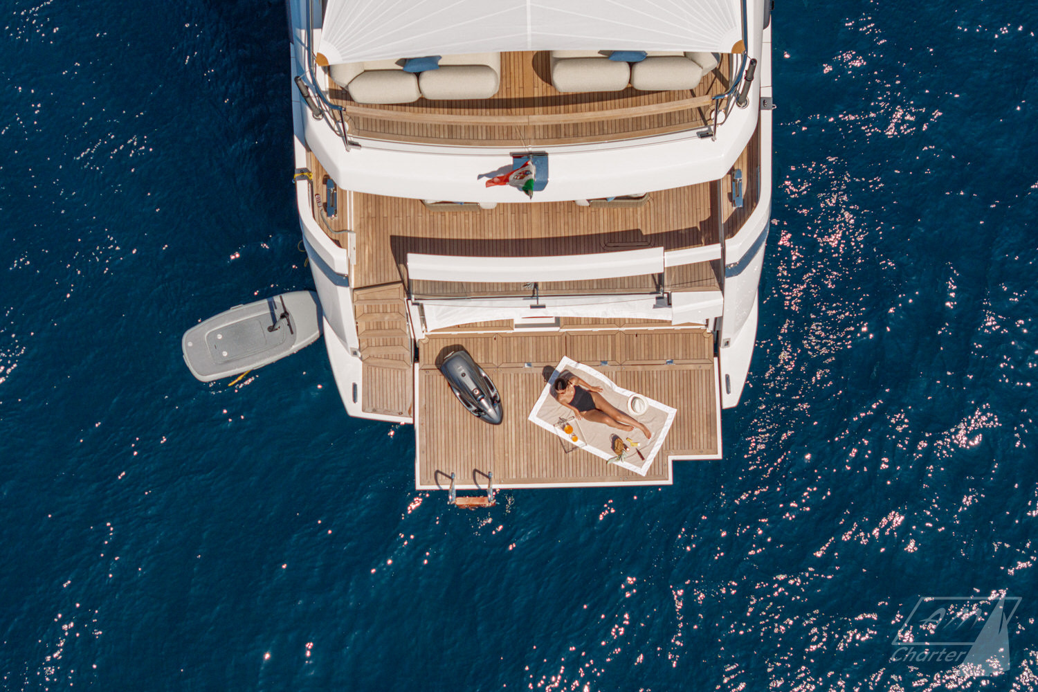 Sanlorenzo SL86A CATCH ME, varato nel 2025, offre molteplici spazi esterni ed interni, senza compromessi. 4 cabine per 8 ospiti (3 matrimoniali, 1 doppia). Il flybridge dispone di prendisole, accoglienti zone relax e di un’area pranzo all’aperto riparata da un hardtop. La vista panoramica a 360 gradi, il tavolo per 8 ospiti e il grande wet bar lo rendono lo spazio perfetto sia per incontri riservati sia per occasioni più animate. A prua, un prendisole affiancato da una confortevole area salotto accoglie gli ospiti in un’atmosfera rilassante, completata da un tavolino ideale per un tè pomeridiano o un cocktail al tramonto. Inoltre lo yacht dispone di stabilizzatori, numerosi giochi d’acqua ed un equipaggio professionale di 4 persone.