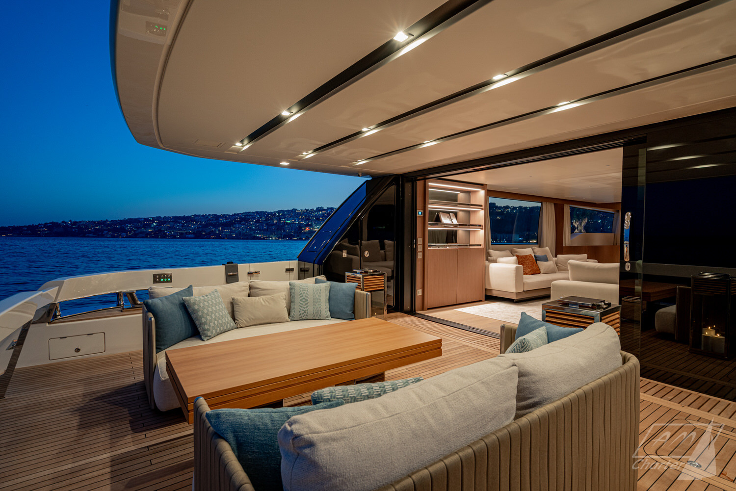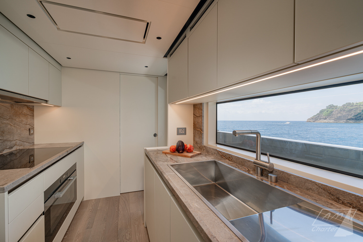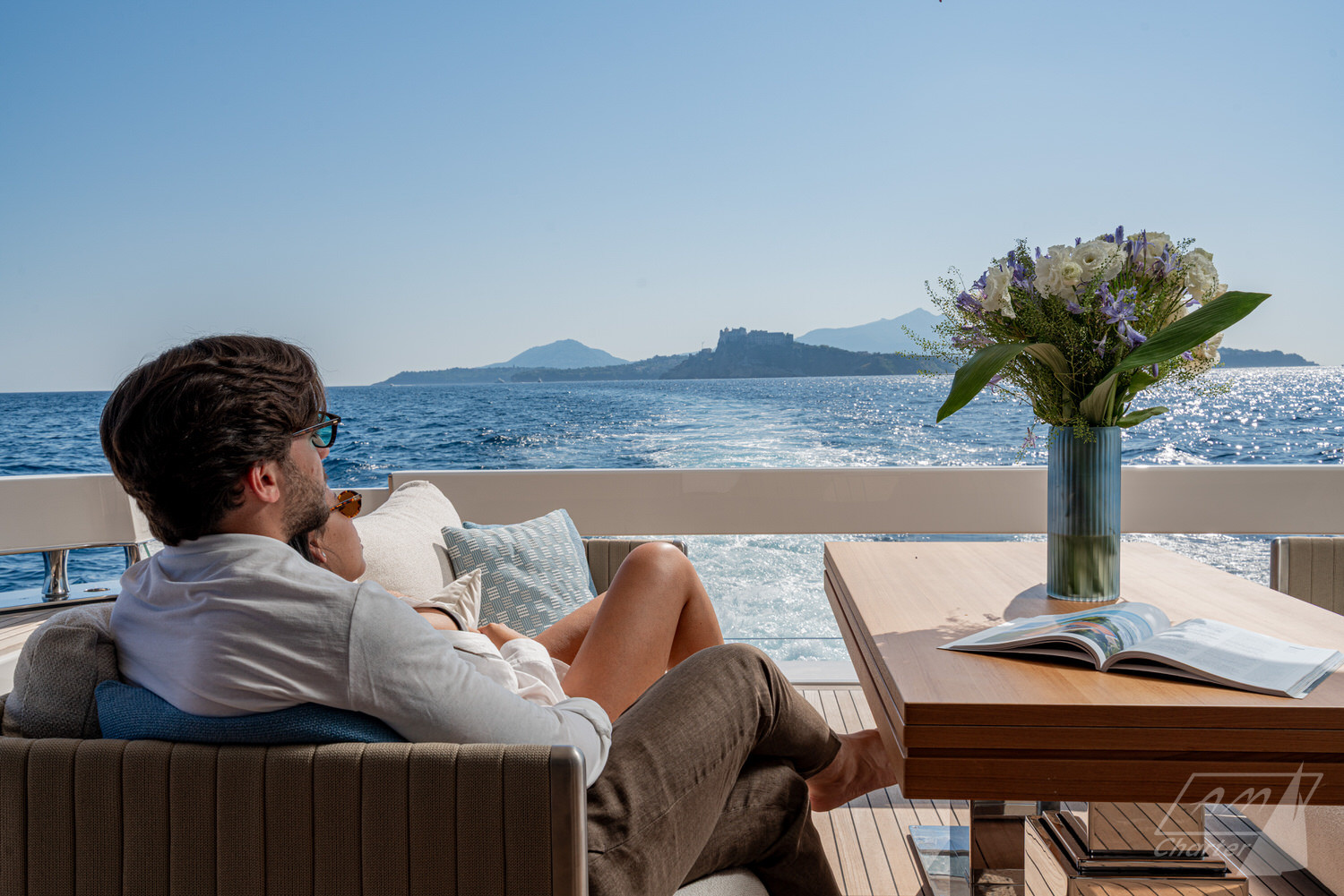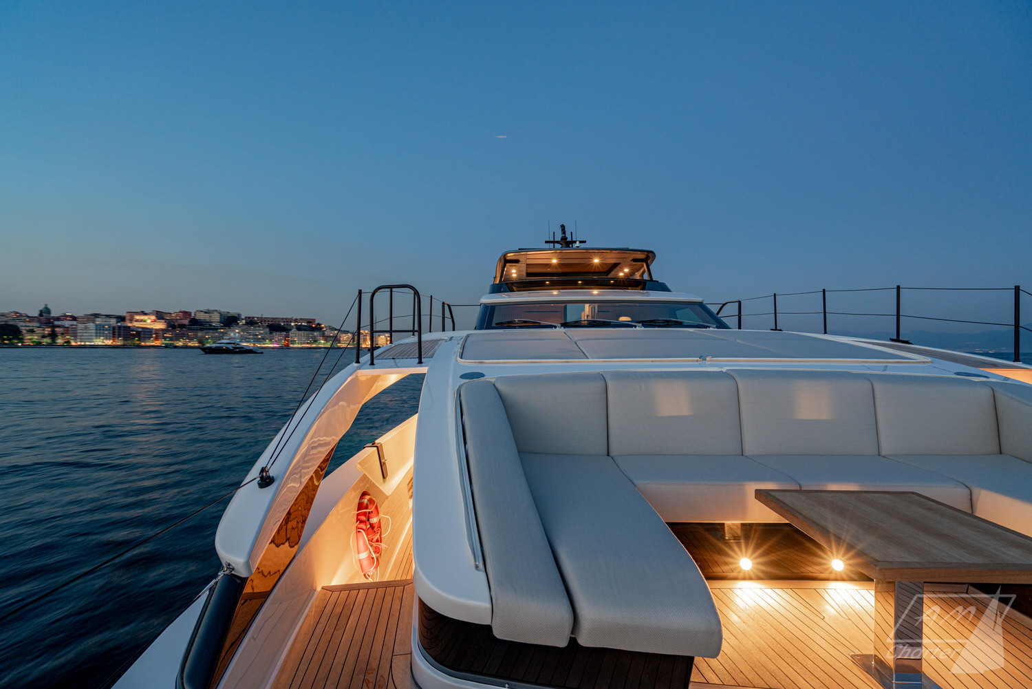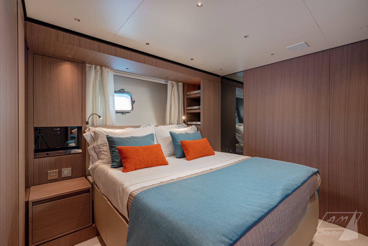 Sanlorenzo SL86A CATCH ME, varato nel 2025, offre molteplici spazi esterni ed interni, senza compromessi. 4 cabine per 8 ospiti (3 matrimoniali, 1 doppia). Il flybridge dispone di prendisole, accoglienti zone relax e di un’area pranzo all’aperto riparata da un hardtop. La vista panoramica a 360 gradi, il tavolo per 8 ospiti e il grande wet bar lo rendono lo spazio perfetto sia per incontri riservati sia per occasioni più animate. A prua, un prendisole affiancato da una confortevole area salotto accoglie gli ospiti in un’atmosfera rilassante, completata da un tavolino ideale per un tè pomeridiano o un cocktail al tramonto. Inoltre lo yacht dispone di stabilizzatori, numerosi giochi d’acqua ed un equipaggio professionale di 4 persone.