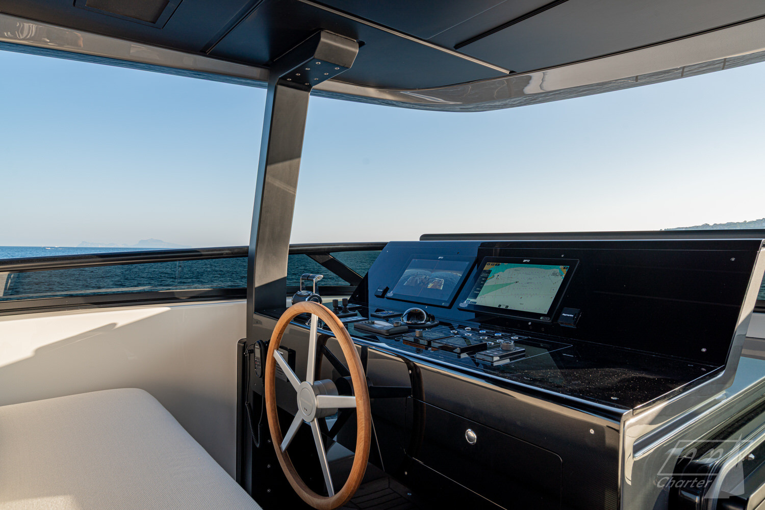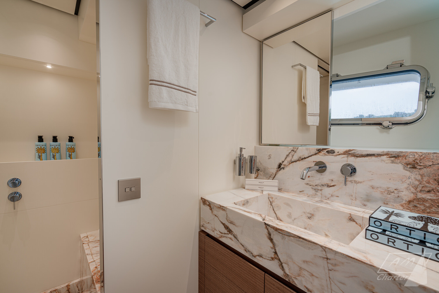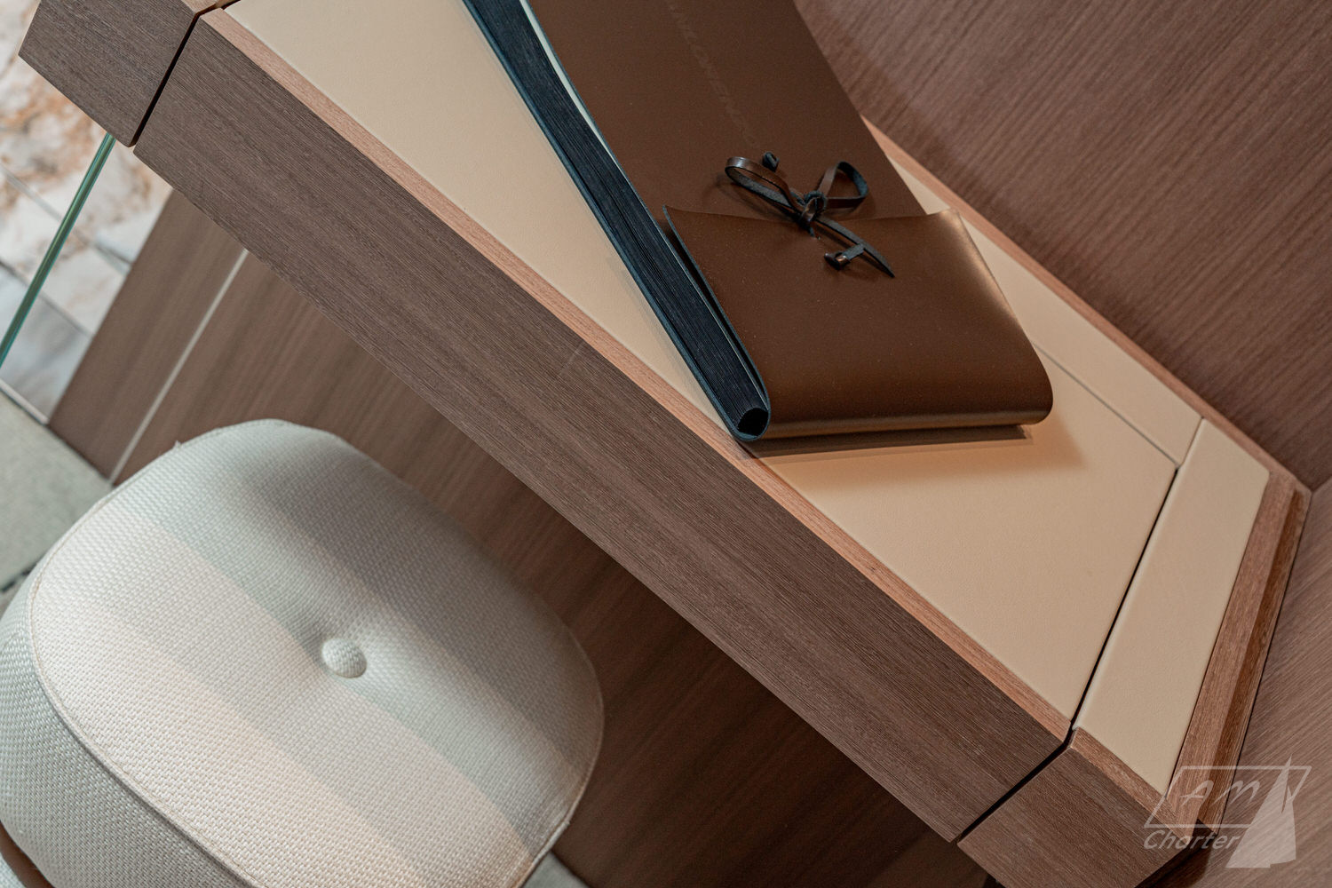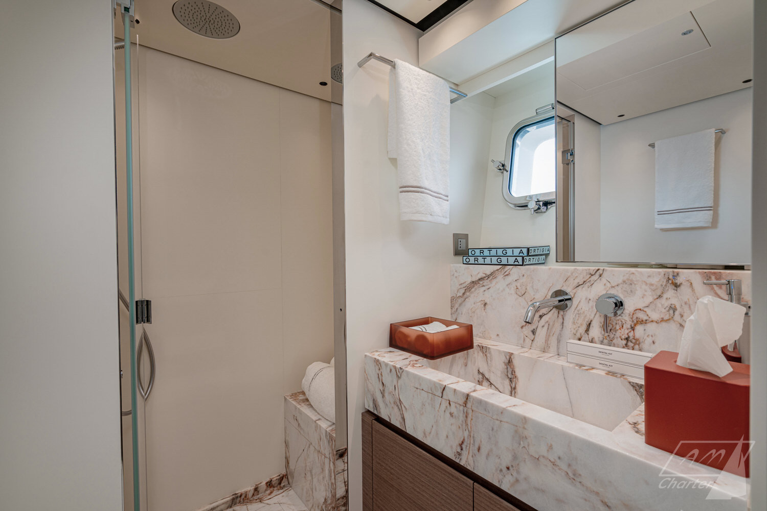 Sanlorenzo SL86A CATCH ME, varato nel 2025, offre molteplici spazi esterni ed interni, senza compromessi. 4 cabine per 8 ospiti (3 matrimoniali, 1 doppia). Il flybridge dispone di prendisole, accoglienti zone relax e di un’area pranzo all’aperto riparata da un hardtop. La vista panoramica a 360 gradi, il tavolo per 8 ospiti e il grande wet bar lo rendono lo spazio perfetto sia per incontri riservati sia per occasioni più animate. A prua, un prendisole affiancato da una confortevole area salotto accoglie gli ospiti in un’atmosfera rilassante, completata da un tavolino ideale per un tè pomeridiano o un cocktail al tramonto. Inoltre lo yacht dispone di stabilizzatori, numerosi giochi d’acqua ed un equipaggio professionale di 4 persone.
