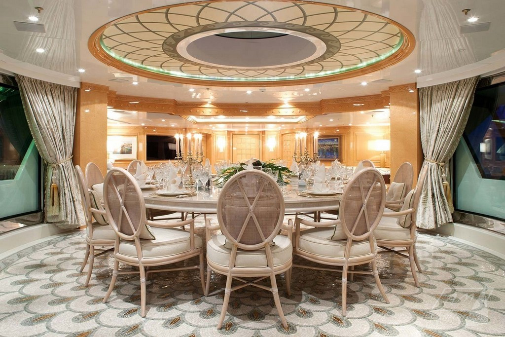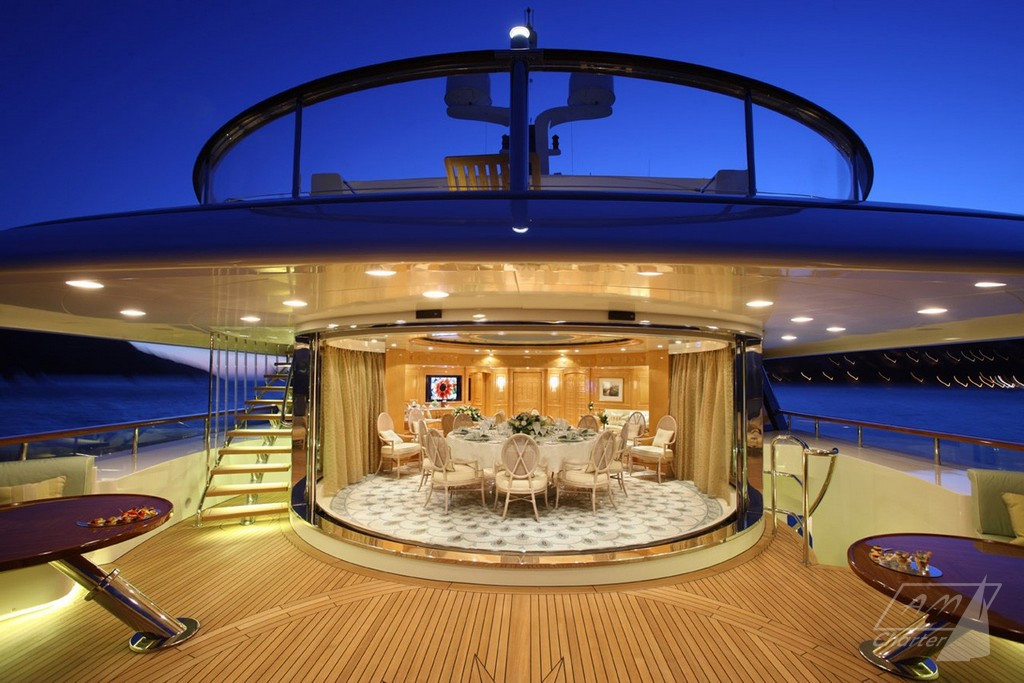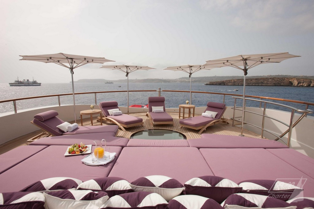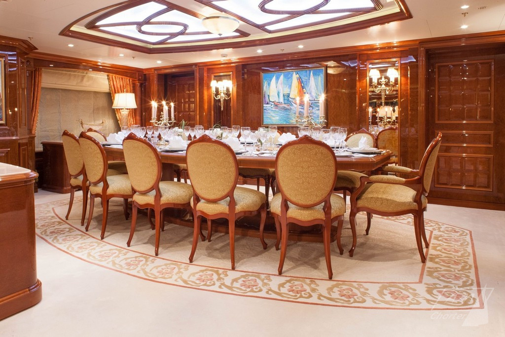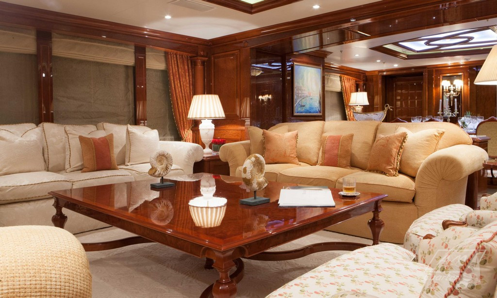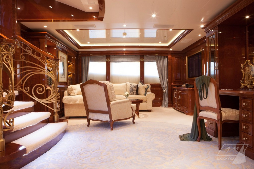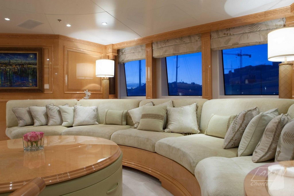 I suoi interni possono ospitare fino a 12 ospiti in sei cabine: una magnifica master suite, una cabina VIP a tutto baglio e quattro camere doppie molto spaziose, che possono essere convertite in doppie, se richiesto. Divisa su due livelli, la master suite dispone di una splendida scala, una sontuosa area salotto, bagno privato e vista panoramica.