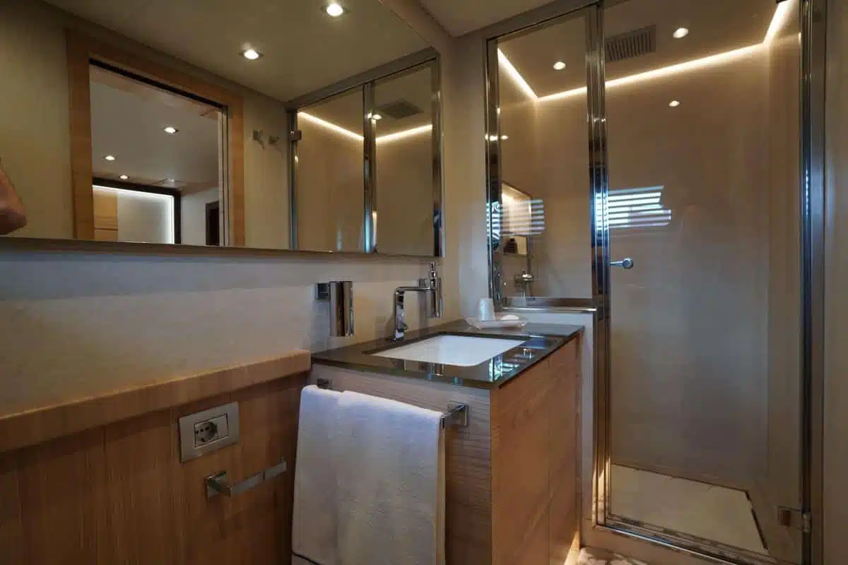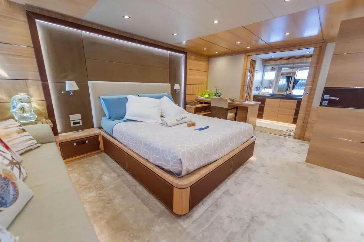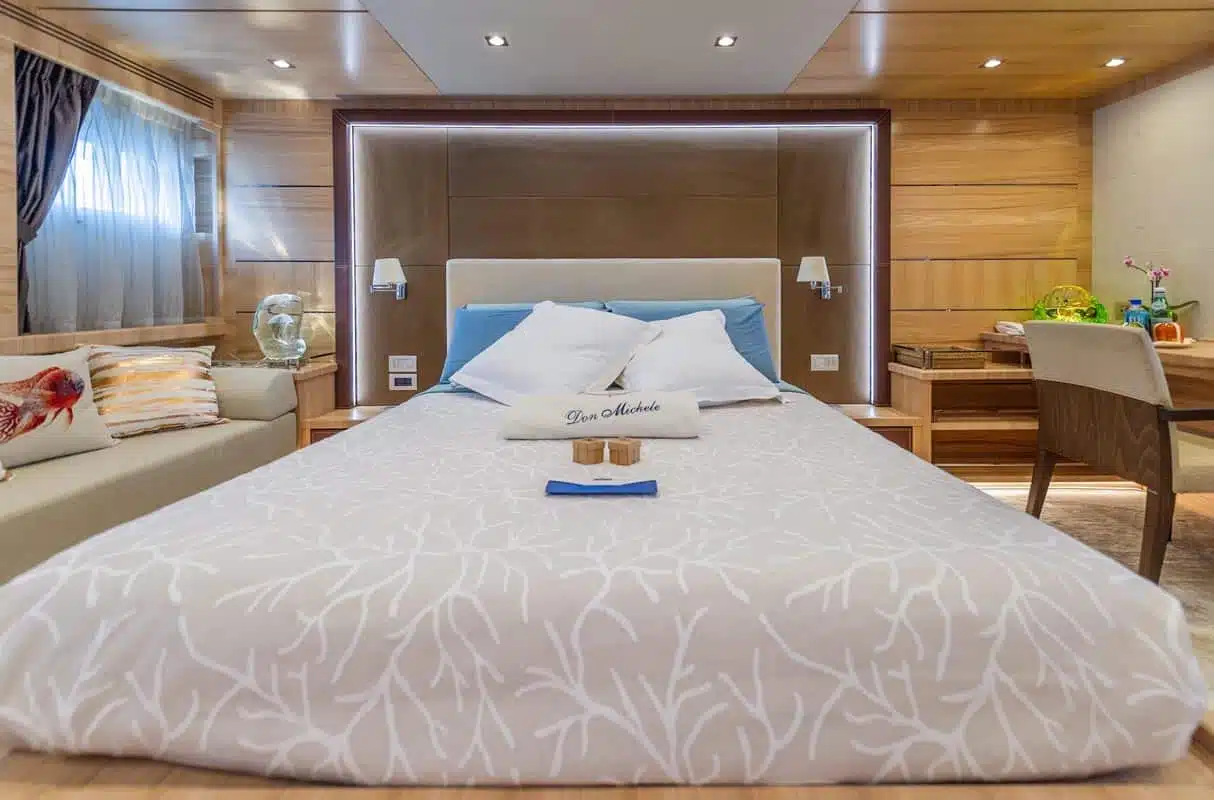 Yacht a motore Don Michele vanta ampi spazi esterni e un incredibile flybridge di 85 mq. Gli interni raffinati e lussuosi sono arredati con gusto e creano un’atmosfera rilassante. L’imbarcazione è dotata di suggestive cabine, tra cui una suite armatoriale, due cabine VIP con letto matrimoniale e due cabine con letto a castello. Ogni cabina è dotata di bagno privato, doccia, armadio, scrivania, cassetta di sicurezza e aria condizionata. Il Main deck ospita un ampio salone con Tv-Lcd DVD 46″, PlayStation 4, cucina indipendente e sala da pranzo. Don Michele è accessibile con sedia a rotelle ed è attrezzato per ospiti con disabilità e passeggeri a mobilità ridotta. Un esperto equipaggio di 6 professionisti vi offrirà un’esperienza indimenticabile a bordo!