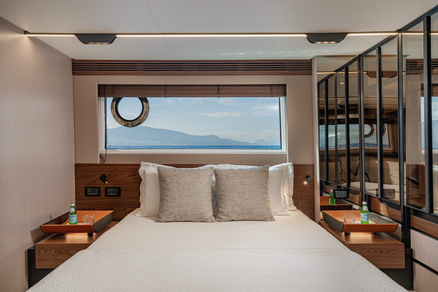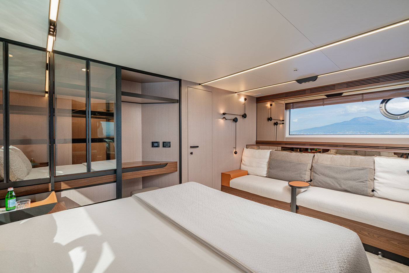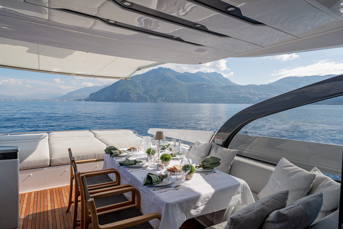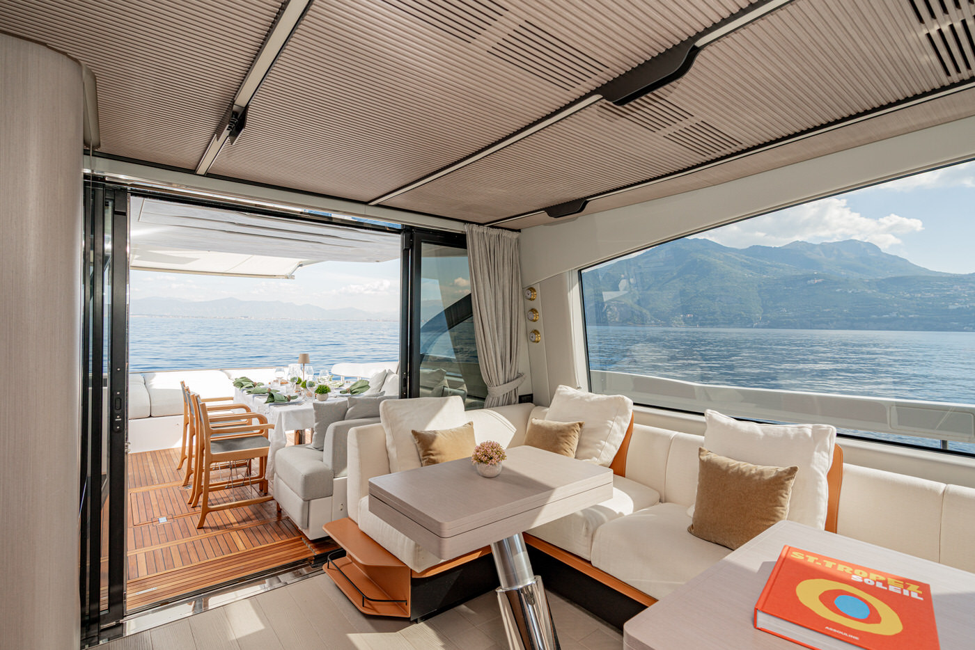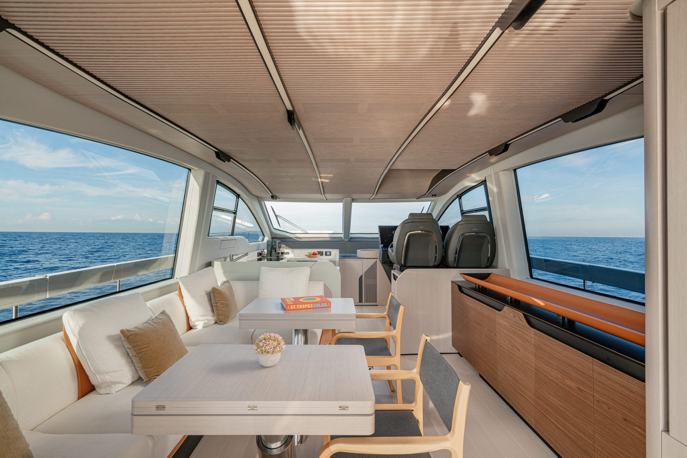 The large side windows flood the saloon with natural light, enhancing the refined and modern atmosphere of the boat.