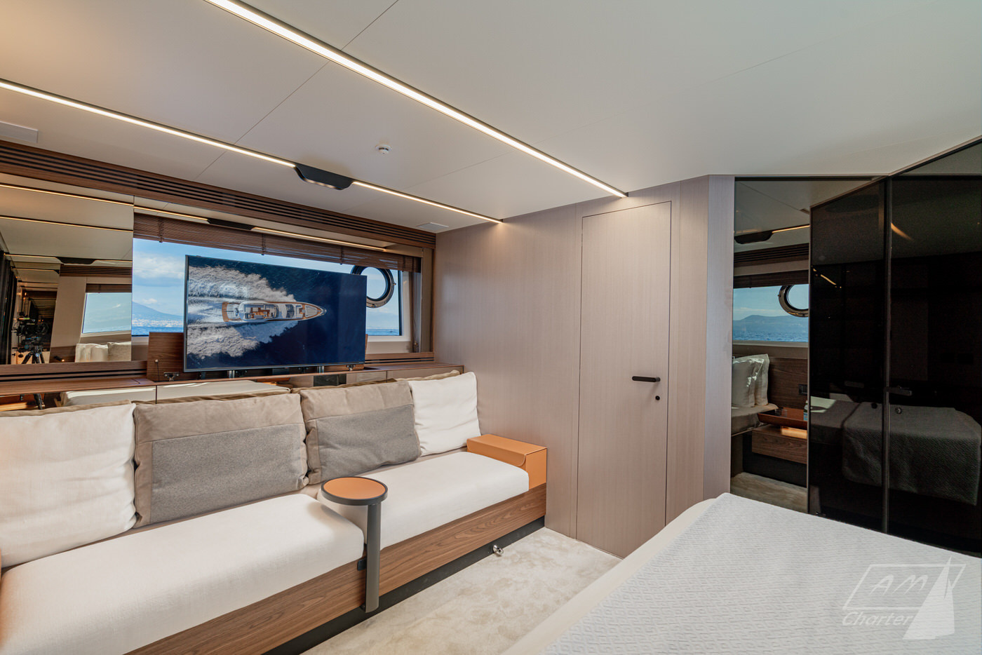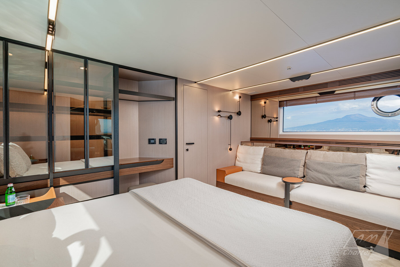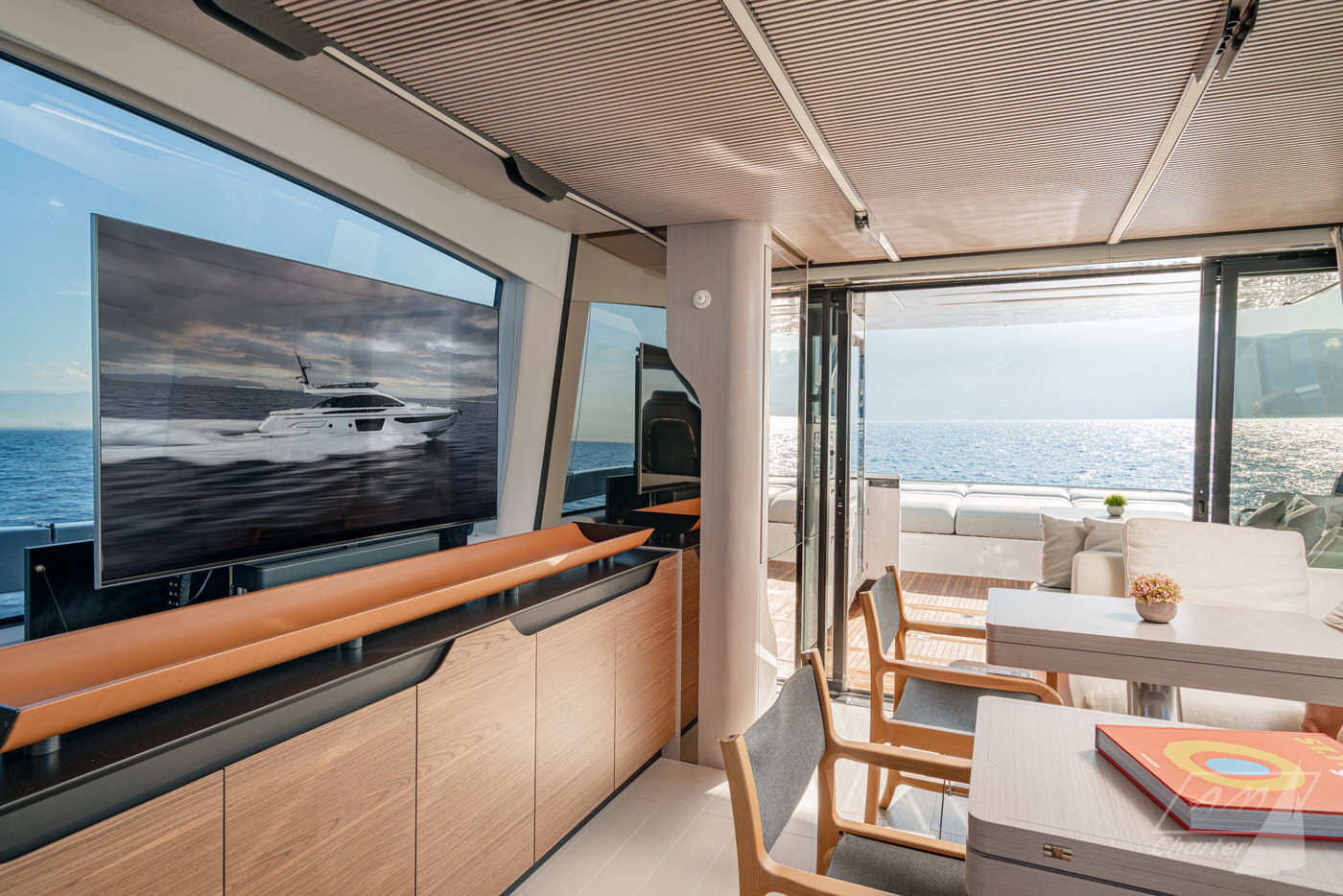 The large side windows flood the saloon with natural light, enhancing the refined and modern atmosphere of the boat.