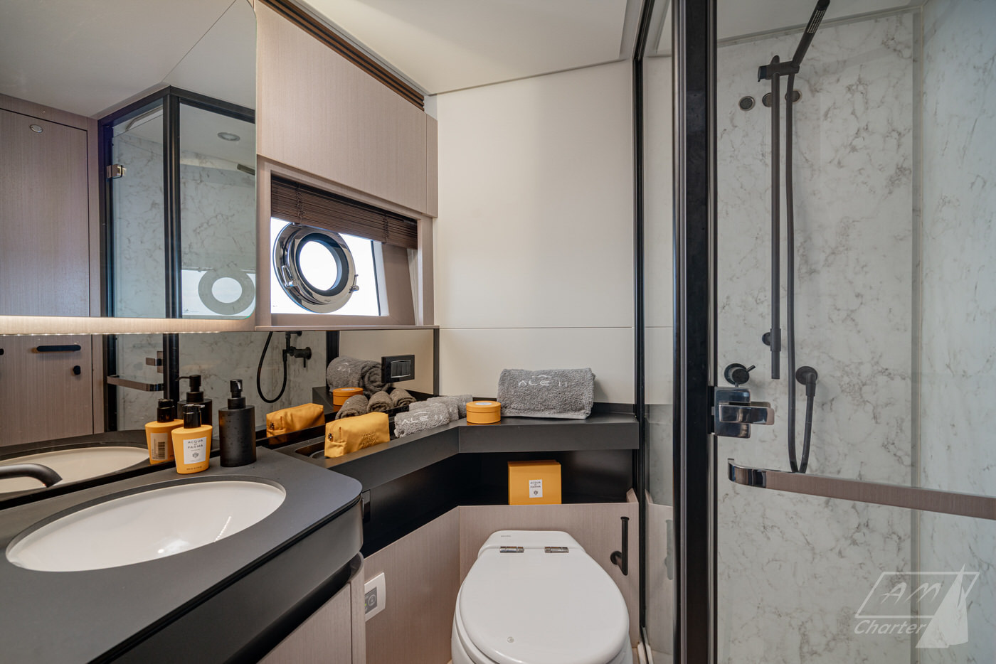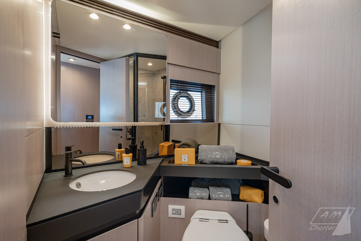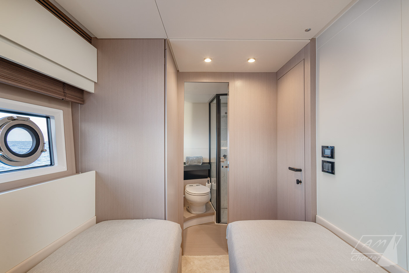 It can accommodate up to 8 guests in 4 cabins: an owner’s suite, a double cabin and two twin cabins. The owner’s cabin has a dedicated wardrobe area and private bathroom; Only one of the twin cabins has no en-suite bathroom.