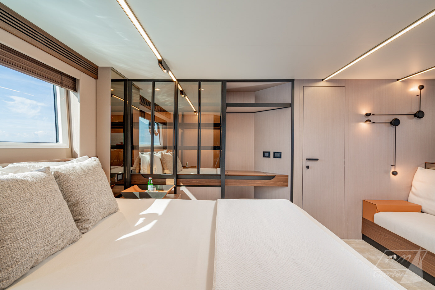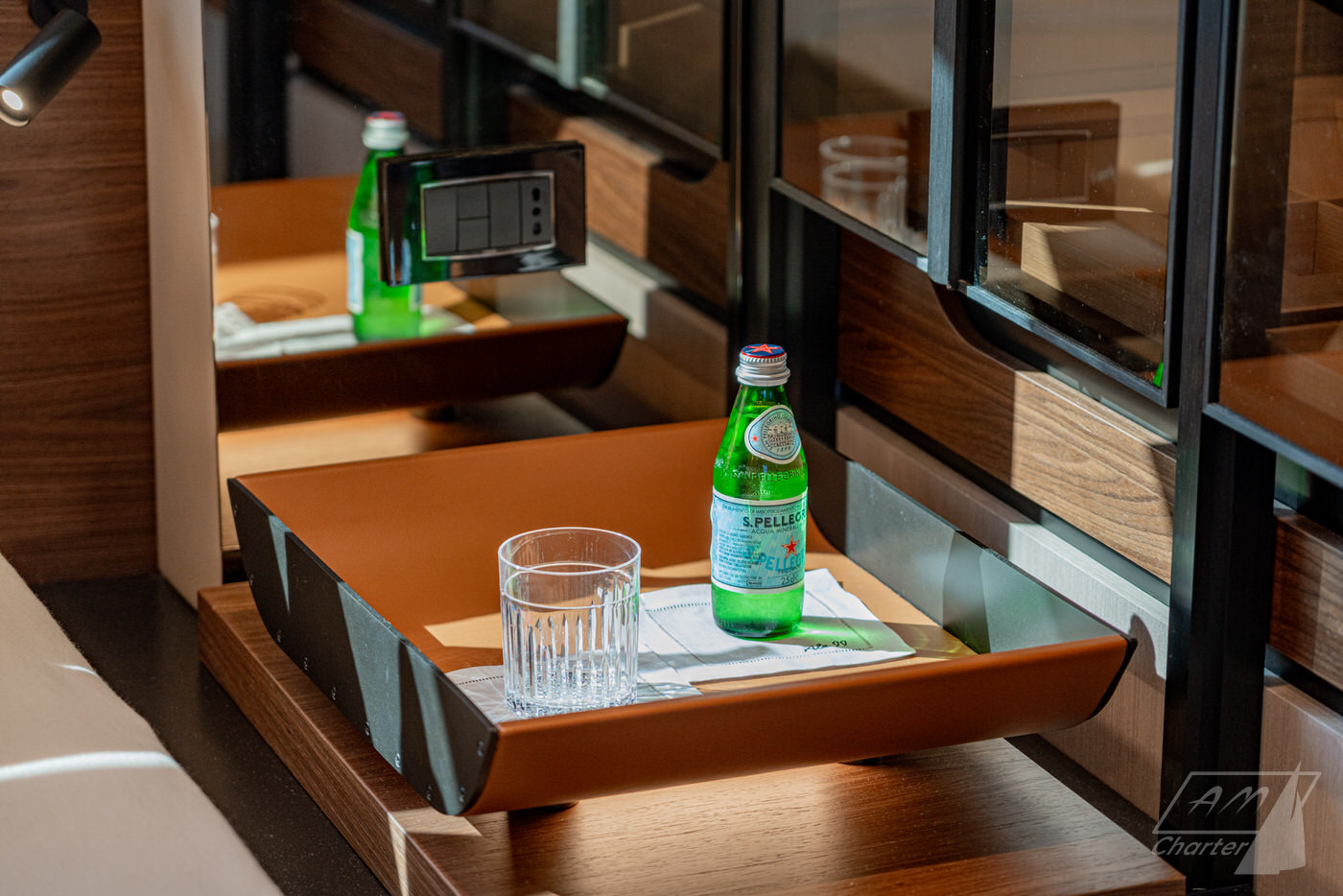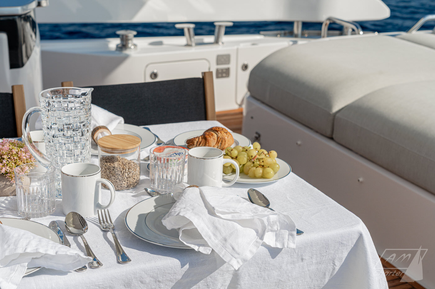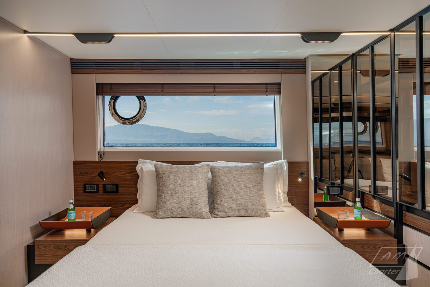 It can accommodate up to 8 guests in 4 cabins: an owner’s suite, a double cabin and two twin cabins. The owner’s cabin has a dedicated wardrobe area and private bathroom; Only one of the twin cabins has no en-suite bathroom.