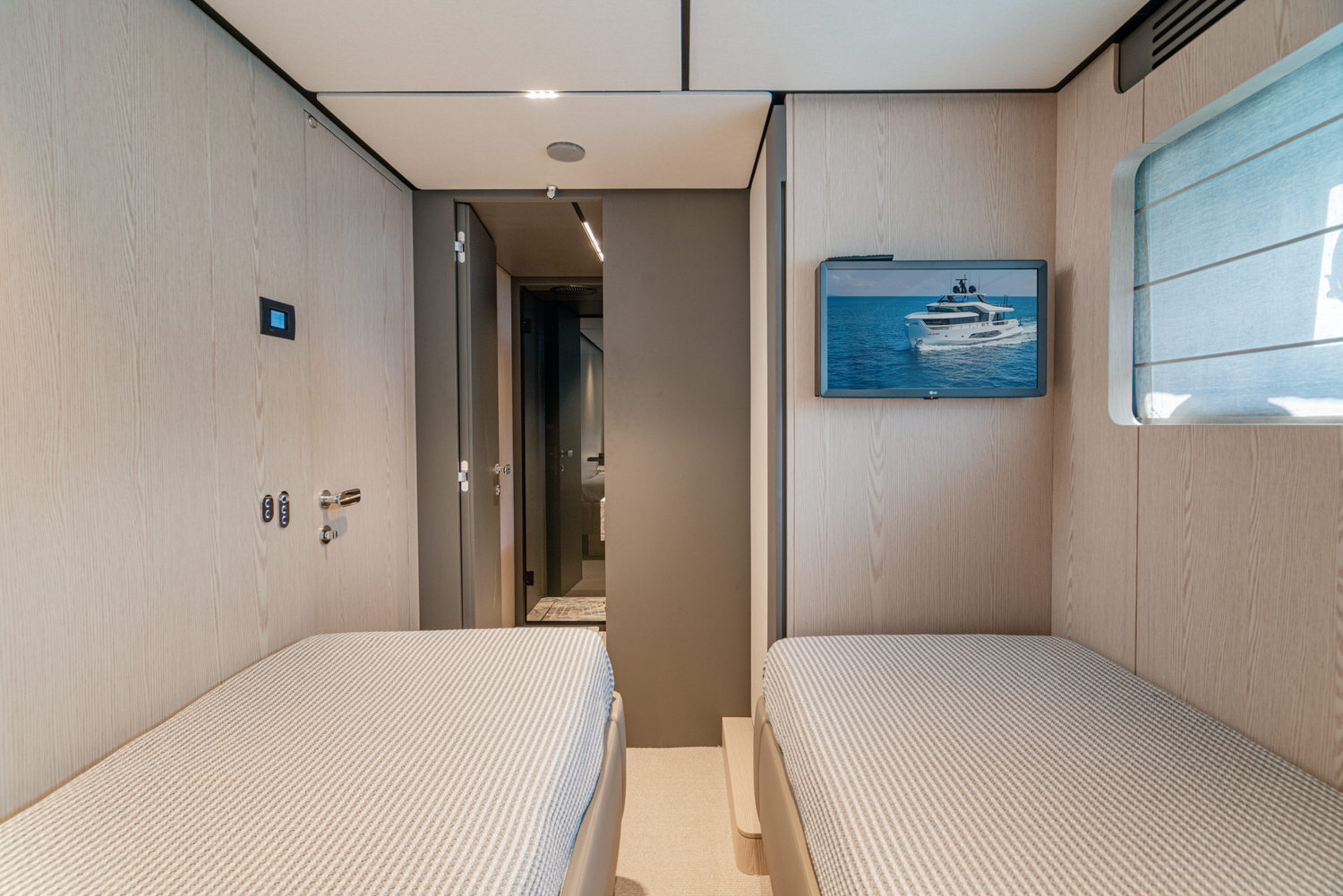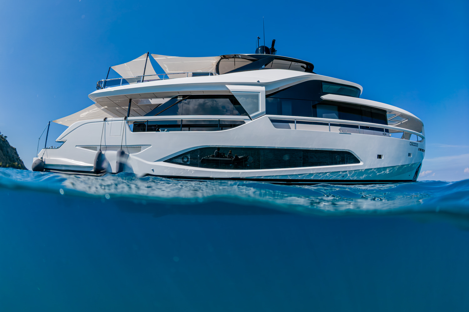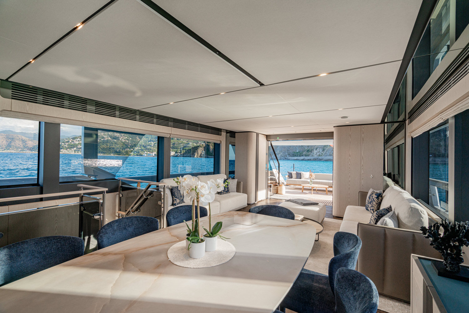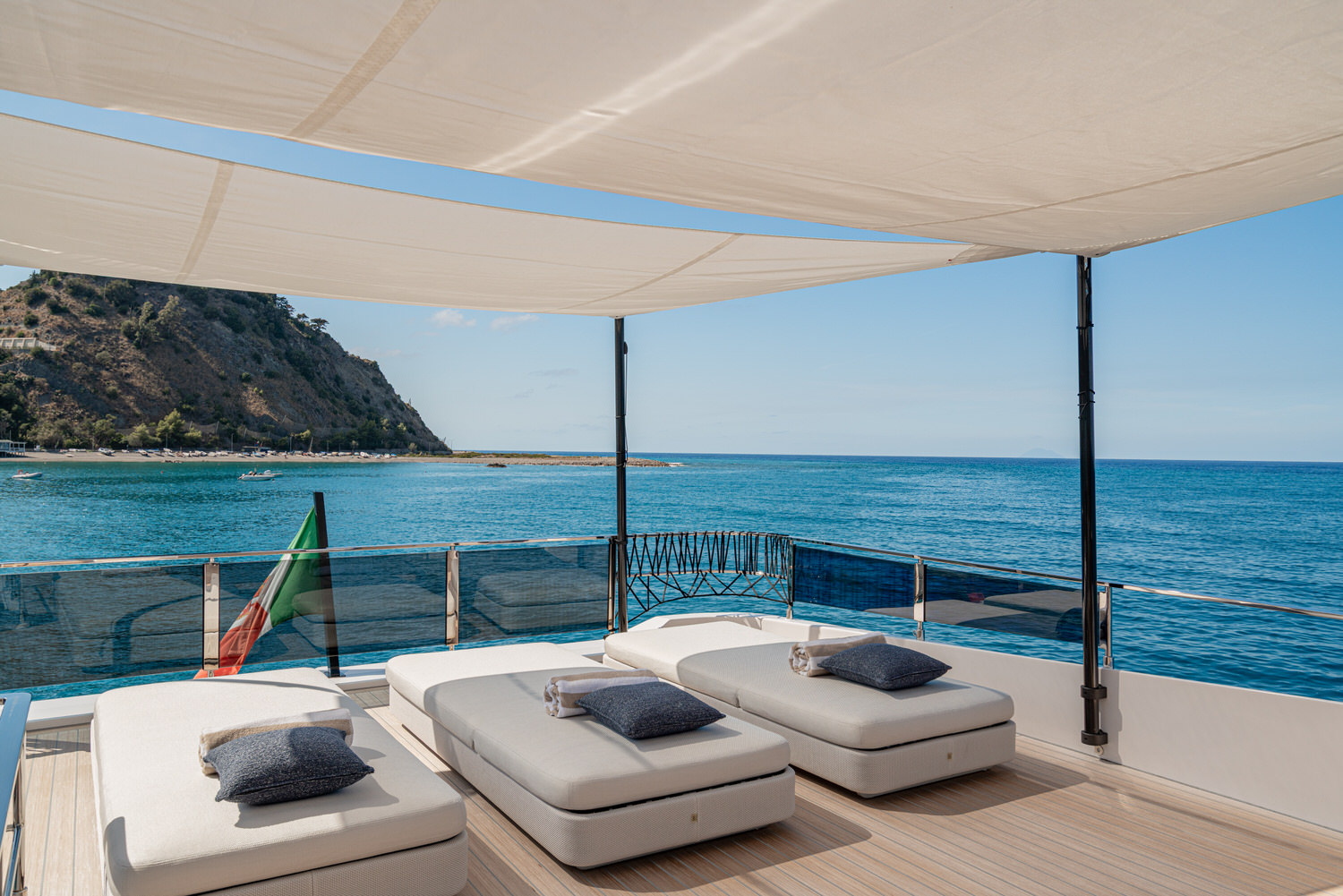 Below deck, 4 large cabins, designed to ensure absolute privacy and relaxation. One of the cabins can be easily configured with single or double beds. Advanced stabilization systems, active both at sea and at anchor, reduce roll and fatigue, making every crossing smoother and anchor stops even more enjoyable. A professional crew of 4 people.