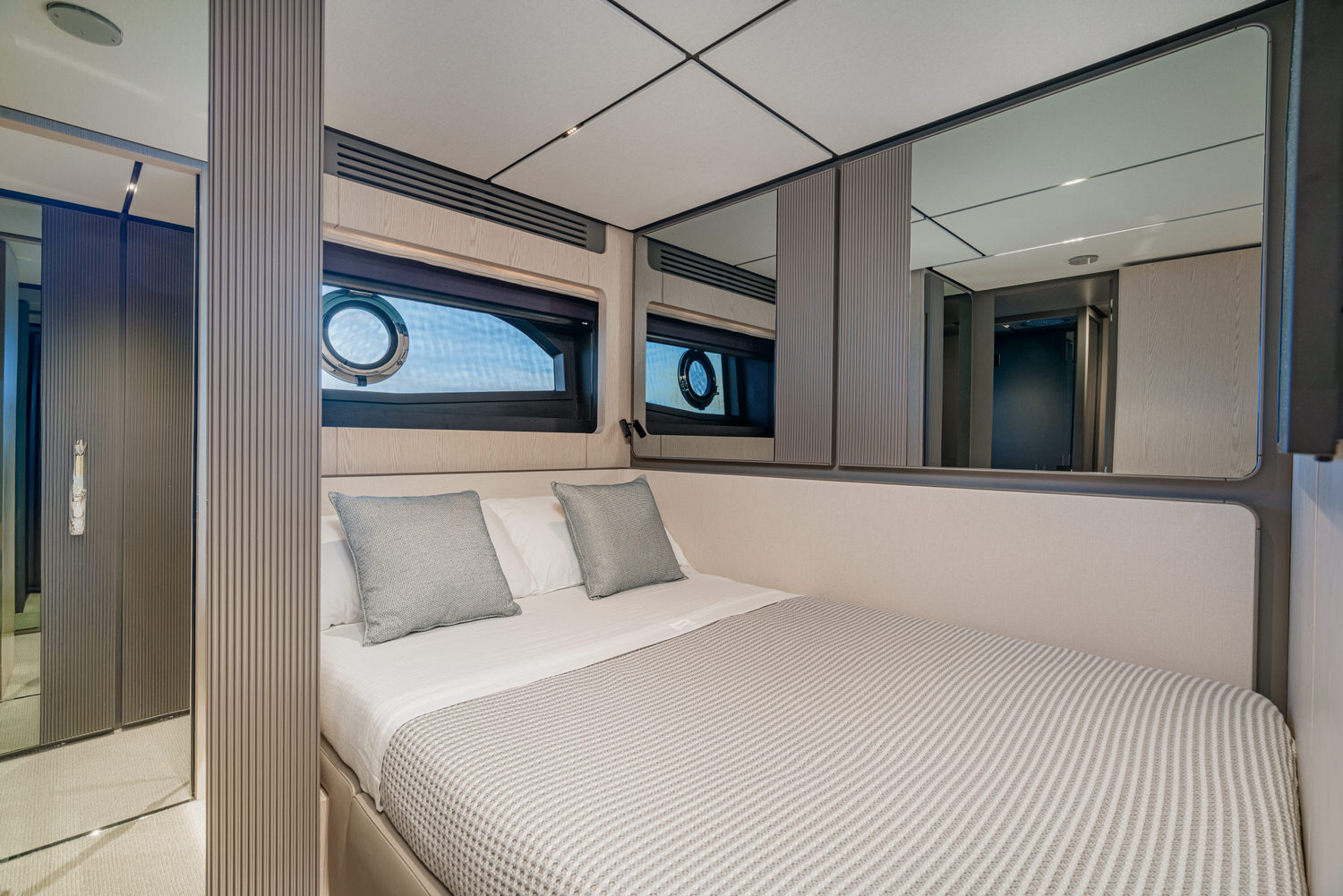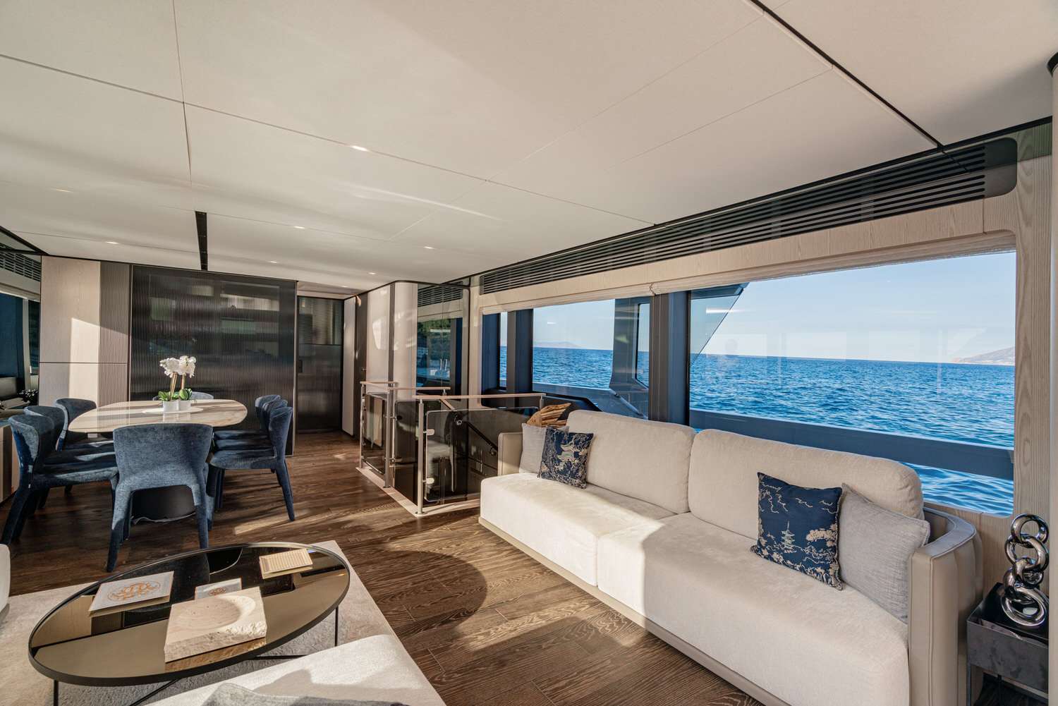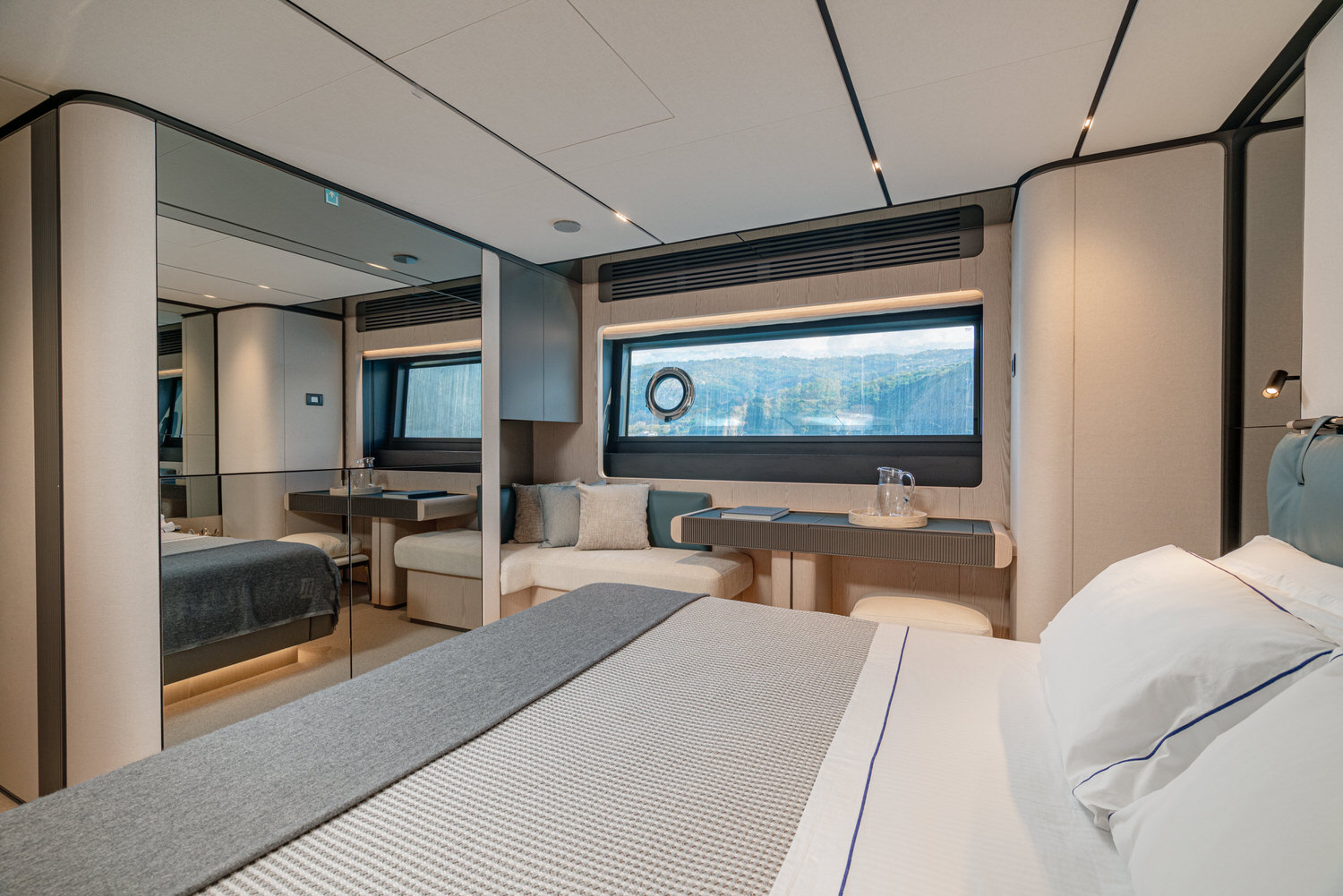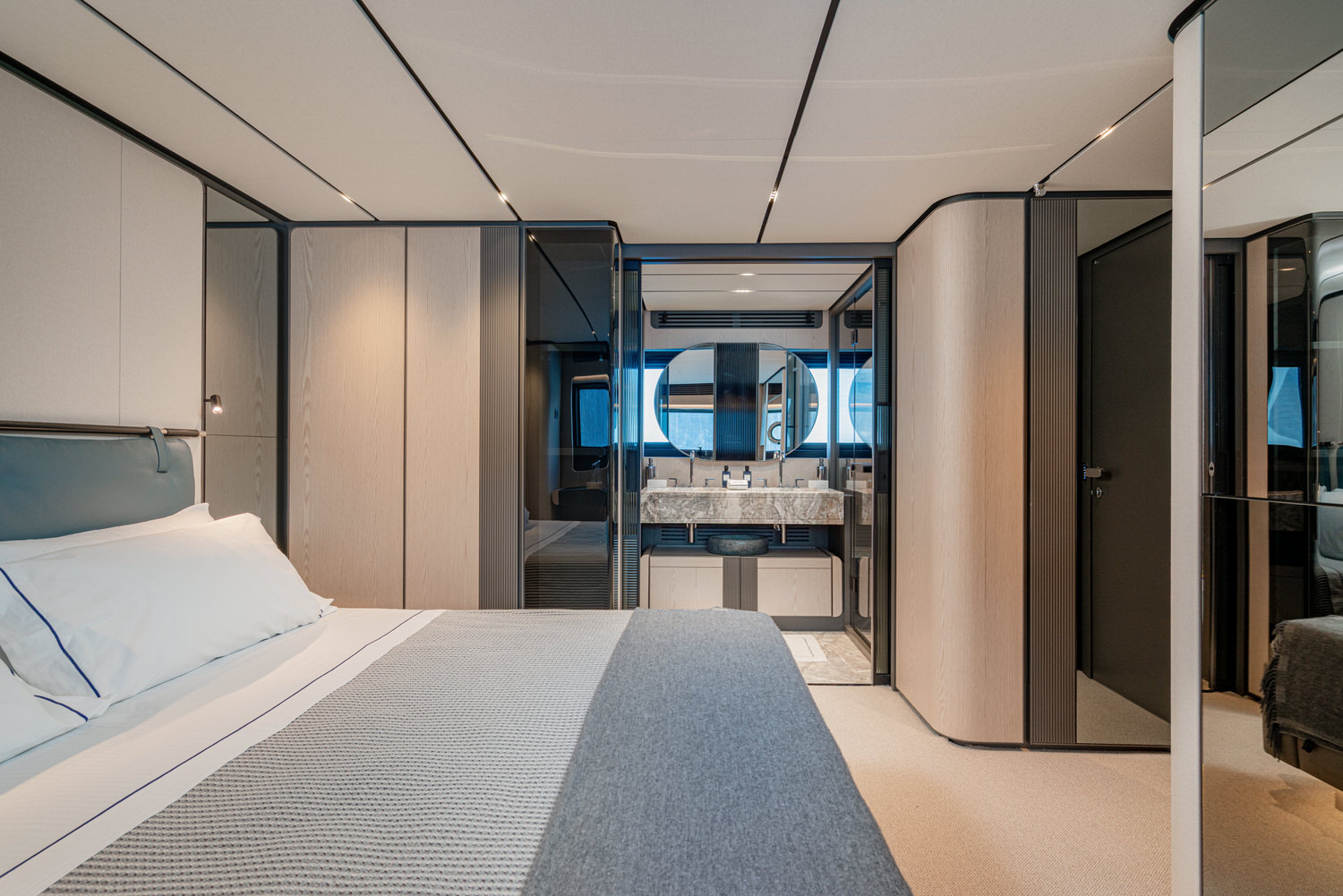 Below deck, 4 large cabins, designed to ensure absolute privacy and relaxation. One of the cabins can be easily configured with single or double beds. Advanced stabilization systems, active both at sea and at anchor, reduce roll and fatigue, making every crossing smoother and anchor stops even more enjoyable. A professional crew of 4 people.