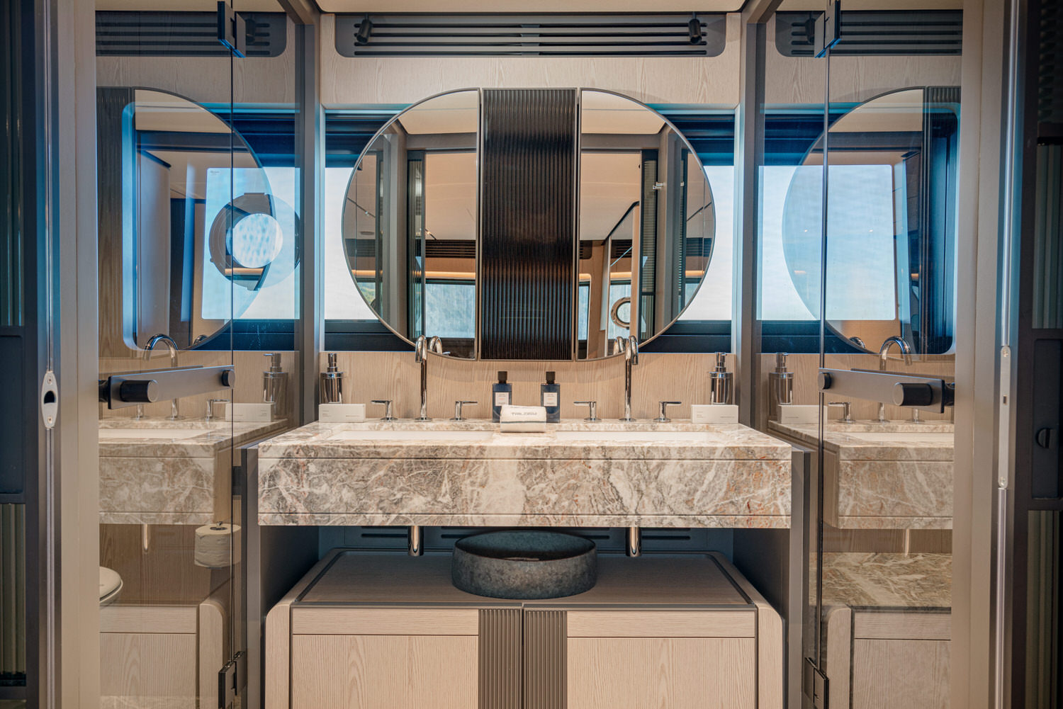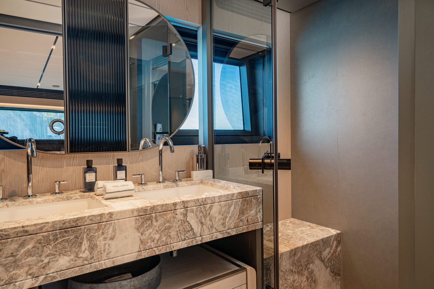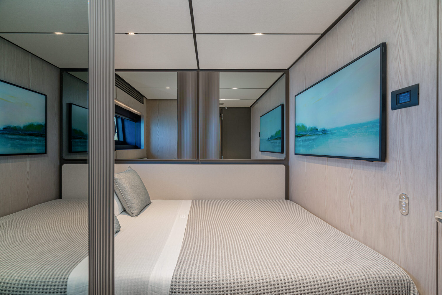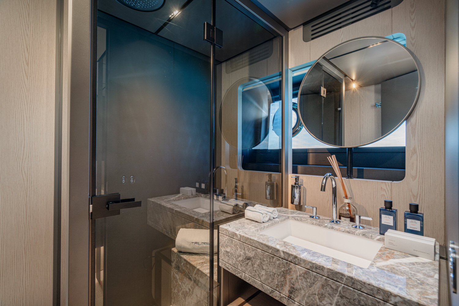 Below deck, 4 large cabins, designed to ensure absolute privacy and relaxation. One of the cabins can be easily configured with single or double beds. Advanced stabilization systems, active both at sea and at anchor, reduce roll and fatigue, making every crossing smoother and anchor stops even more enjoyable. A professional crew of 4 people.