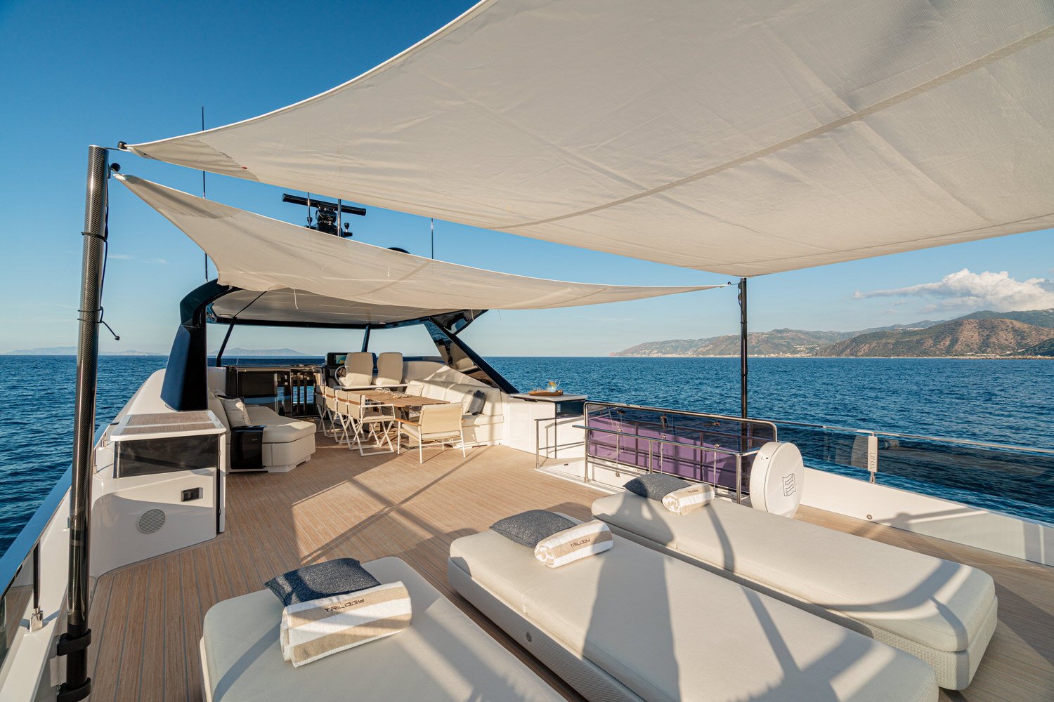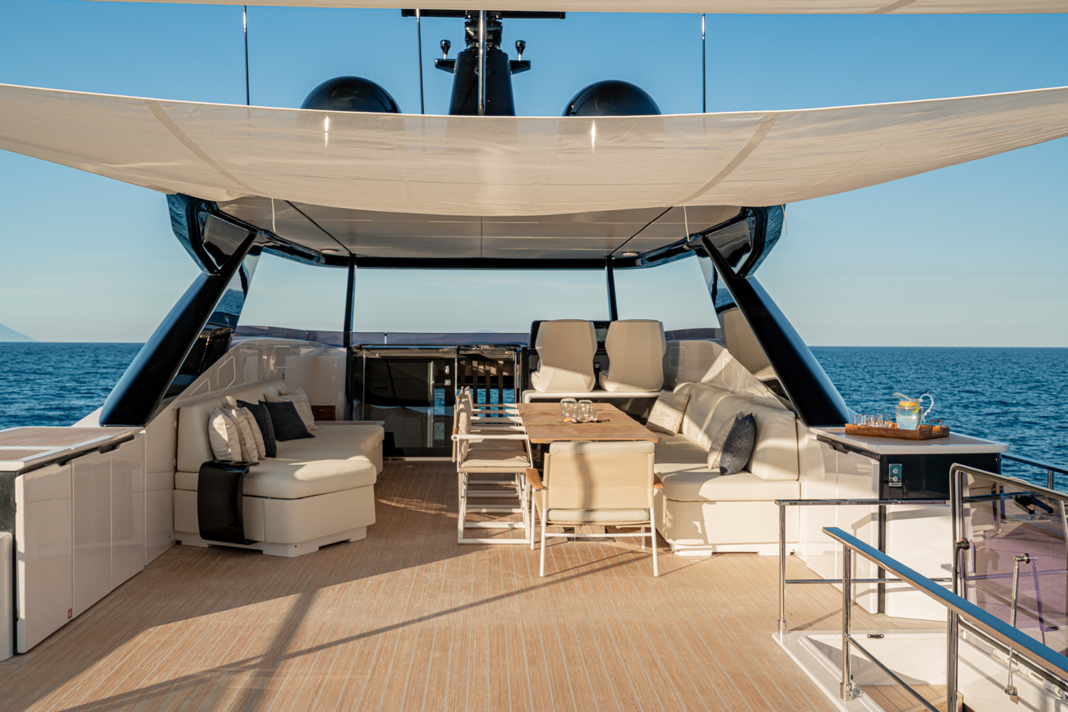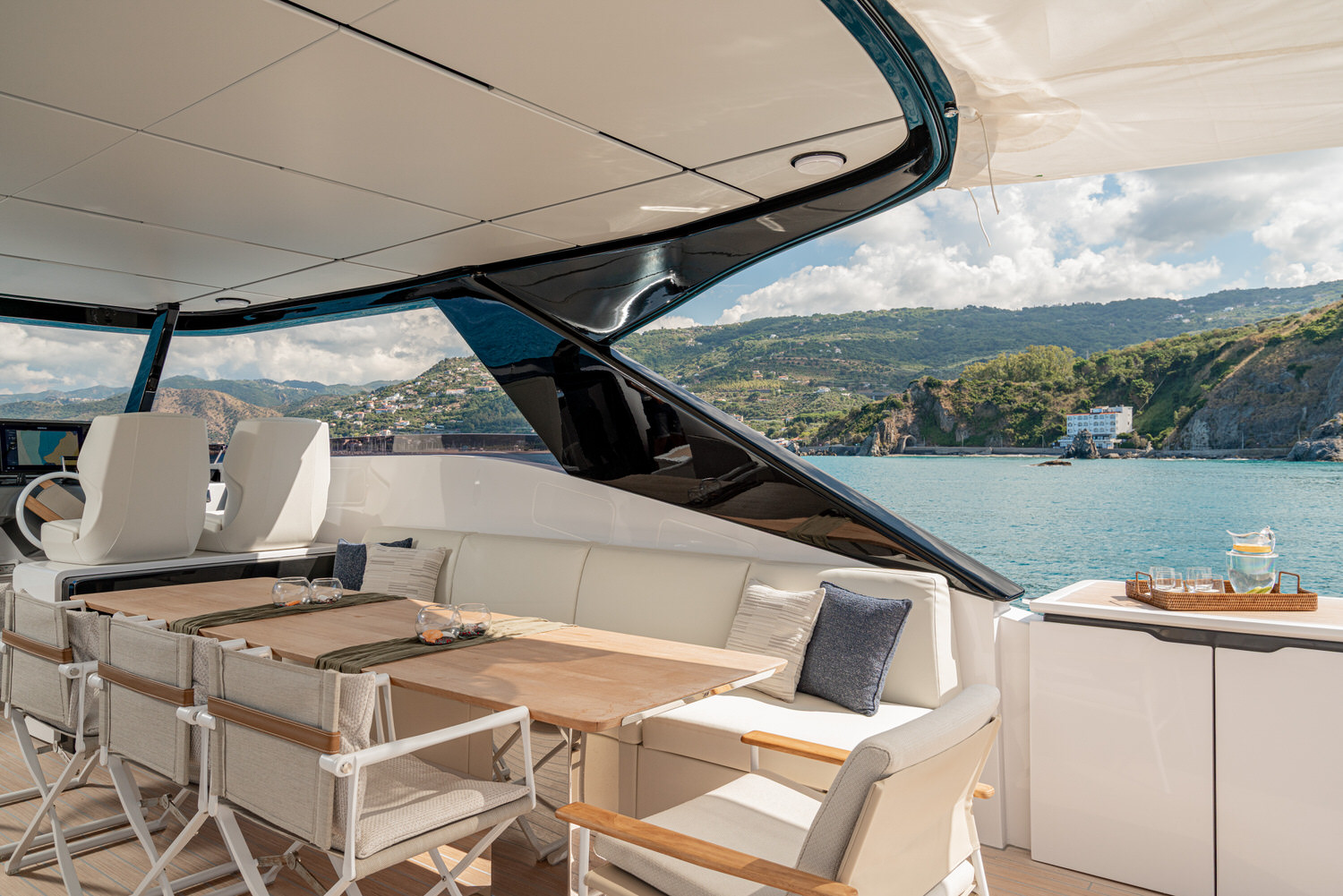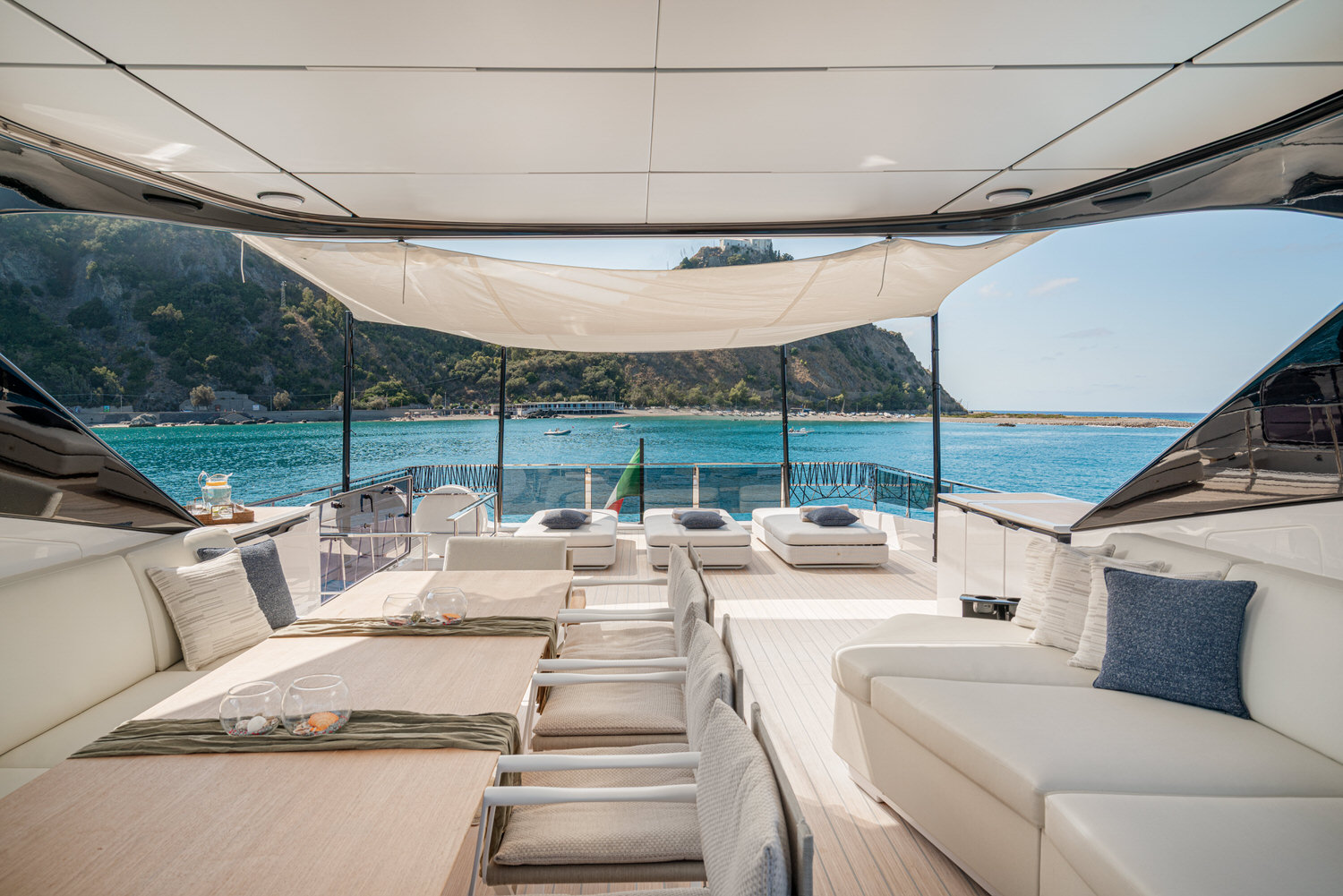 Welcome aboard the Ferretti INFYNITO 80 TRILOGY, a yacht designed for those who want to experience the sea in the open air, without sacrificing comfort. The iconic covered terrace, a true hallmark of the INFYNITO 80, extends harmoniously from the superstructure like a panoramic suite suspended over the sea: reserved, welcoming and with a breathtaking view.