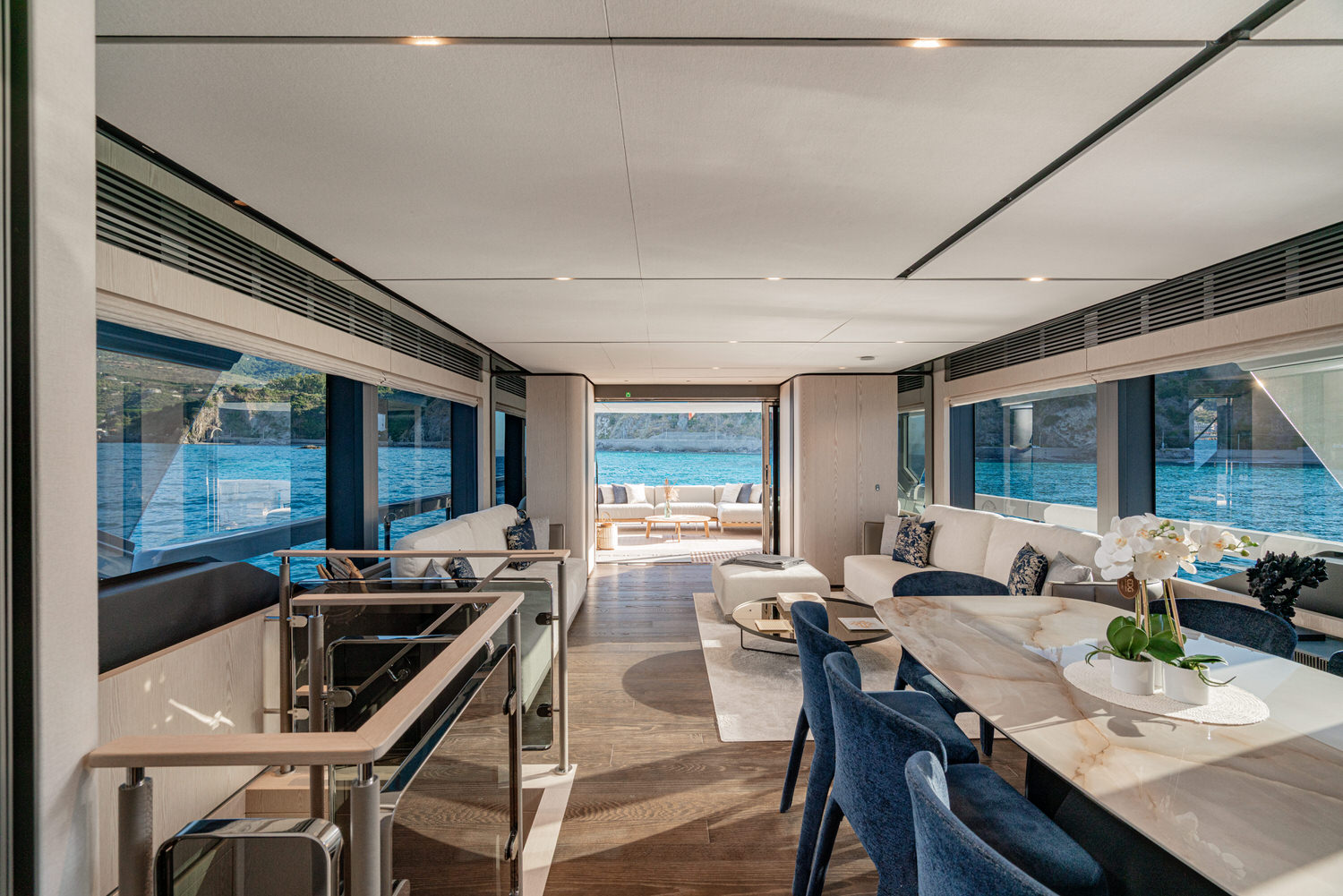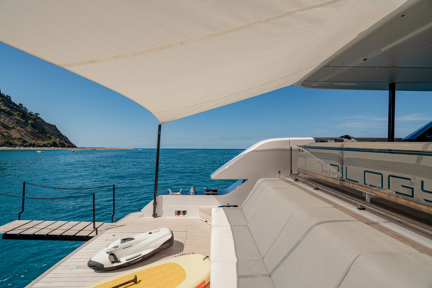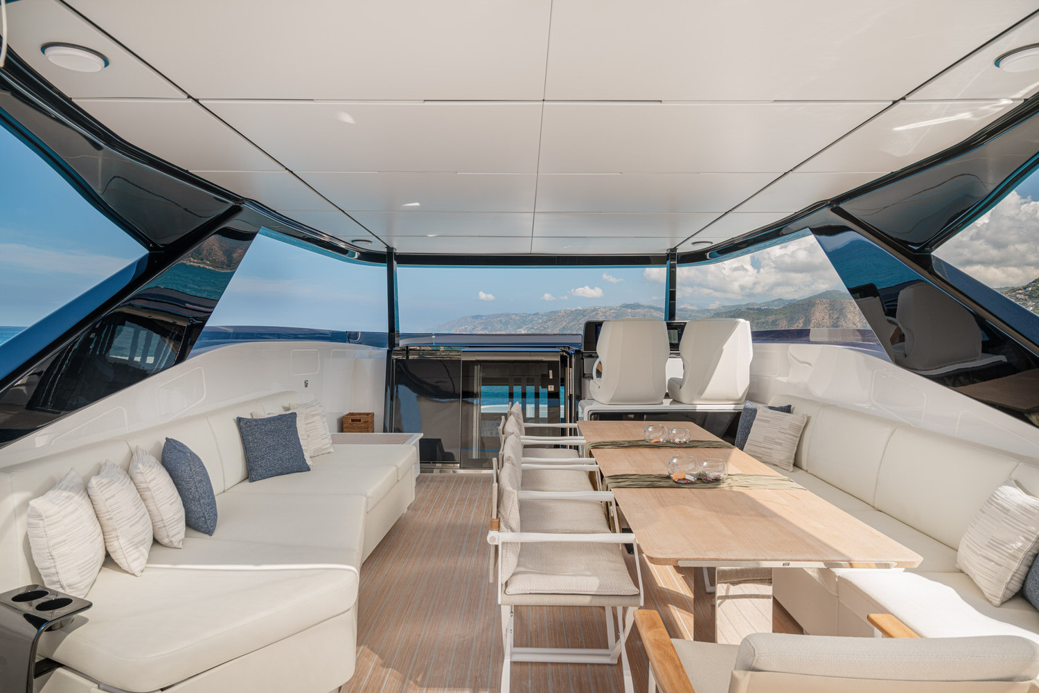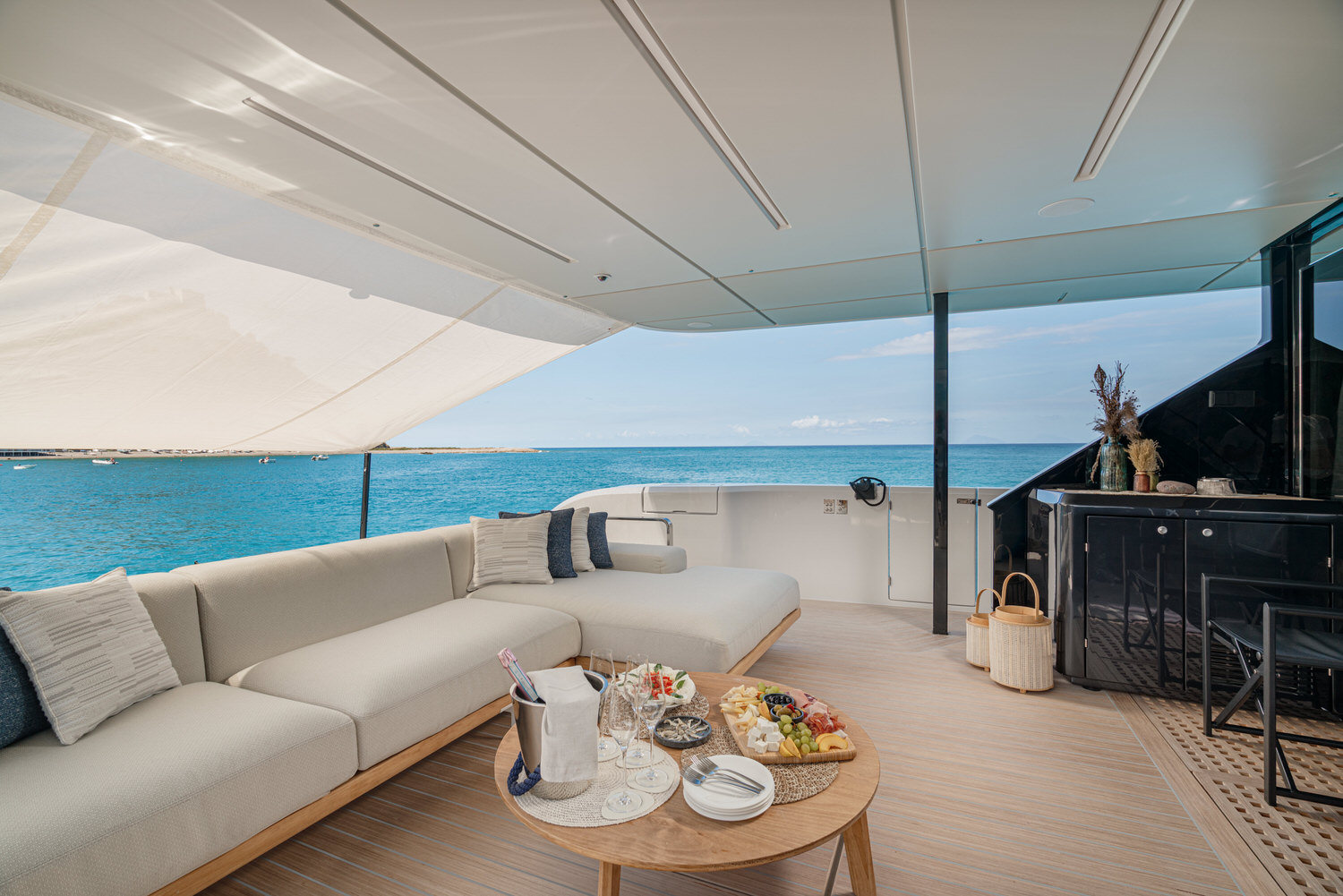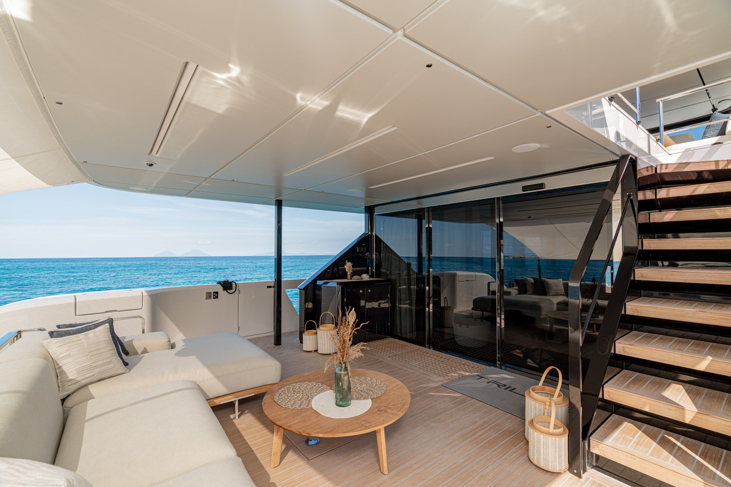 Welcome aboard the Ferretti INFYNITO 80 TRILOGY, a yacht designed for those who want to experience the sea in the open air, without sacrificing comfort. The iconic covered terrace, a true hallmark of the INFYNITO 80, extends harmoniously from the superstructure like a panoramic suite suspended over the sea: reserved, welcoming and with a breathtaking view.