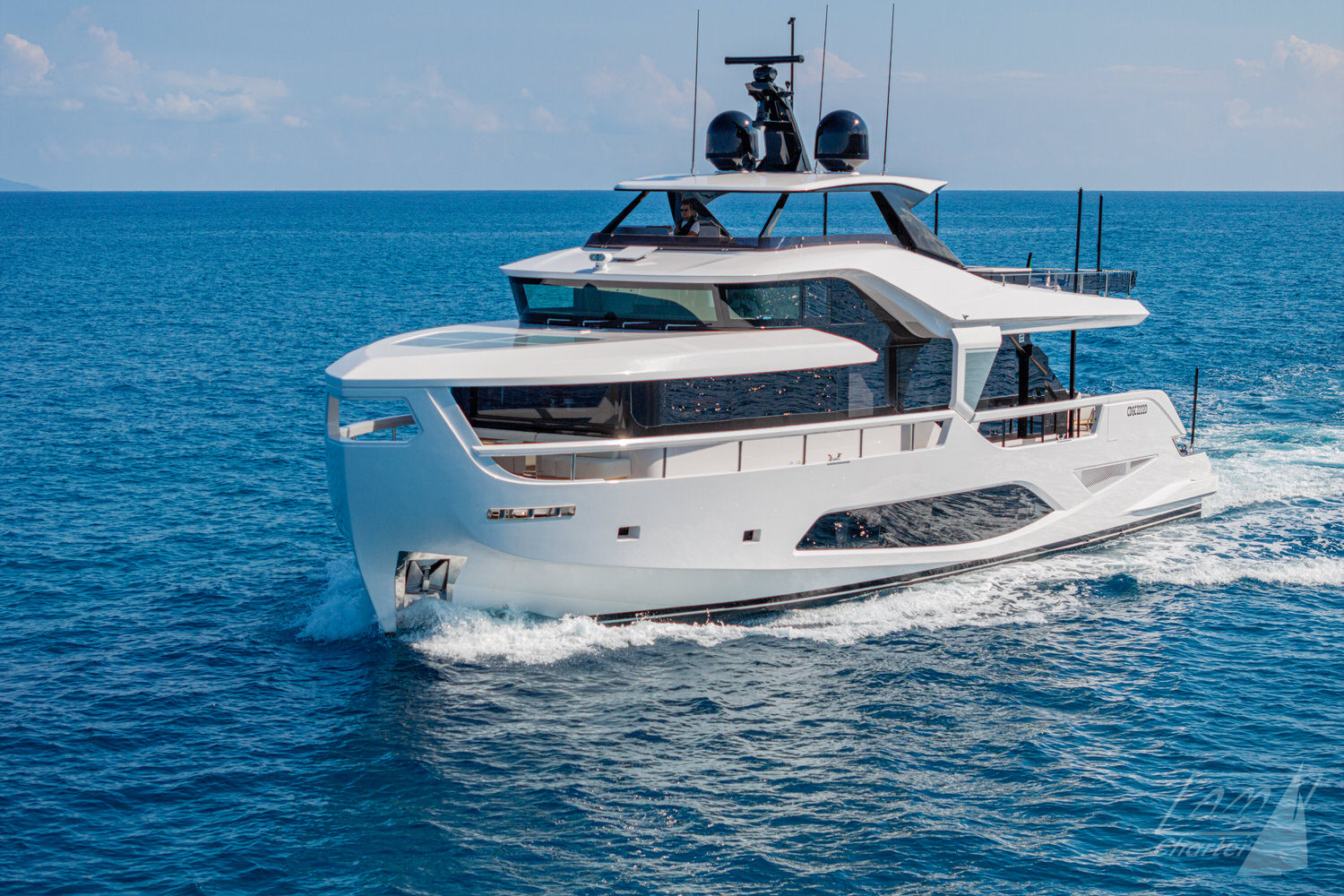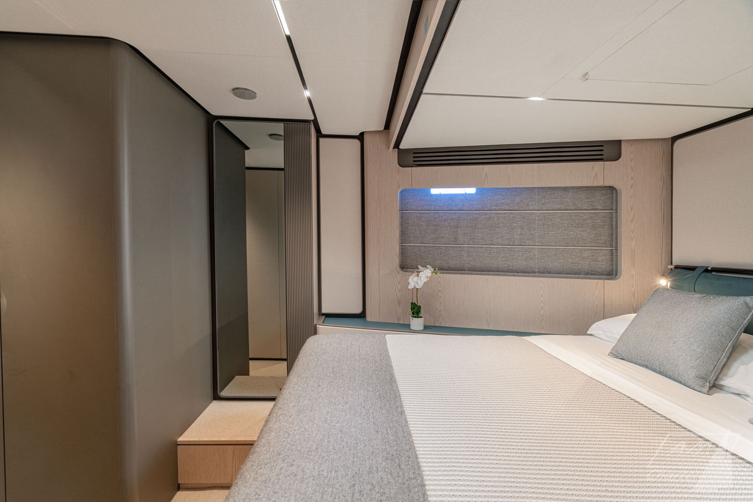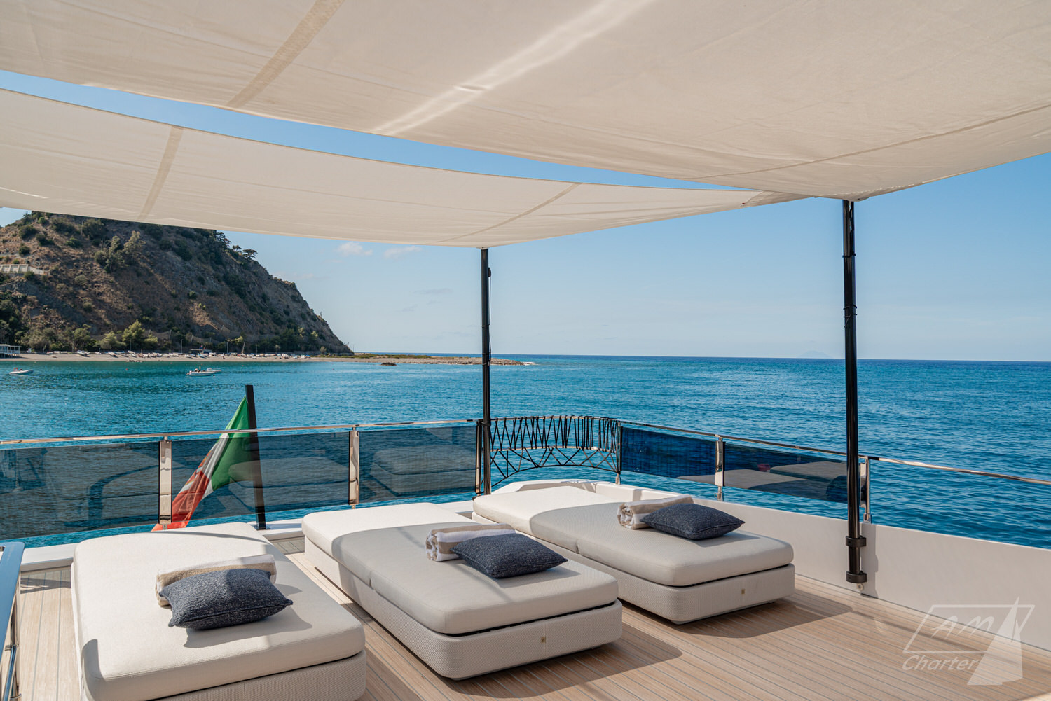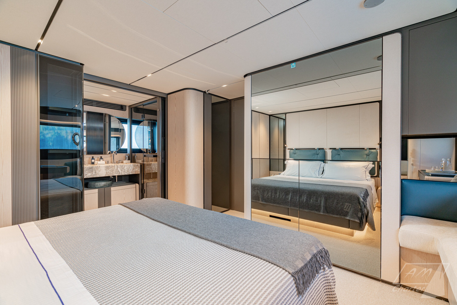 Below deck, 4 large cabins, designed to ensure absolute privacy and relaxation. One of the cabins can be easily configured with single or double beds. Advanced stabilization systems, active both at sea and at anchor, reduce roll and fatigue, making every crossing smoother and anchor stops even more enjoyable. A professional crew of 4 people.