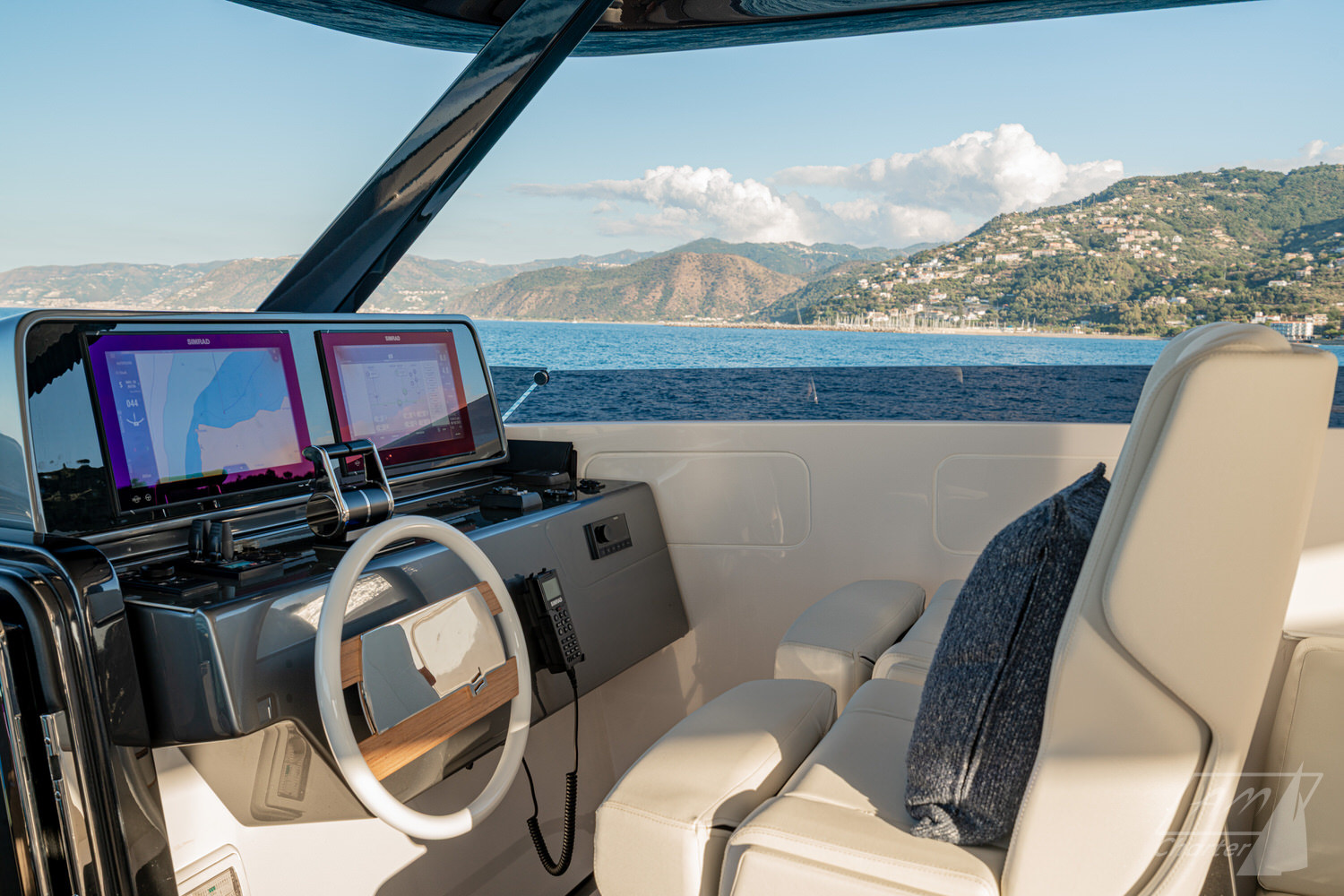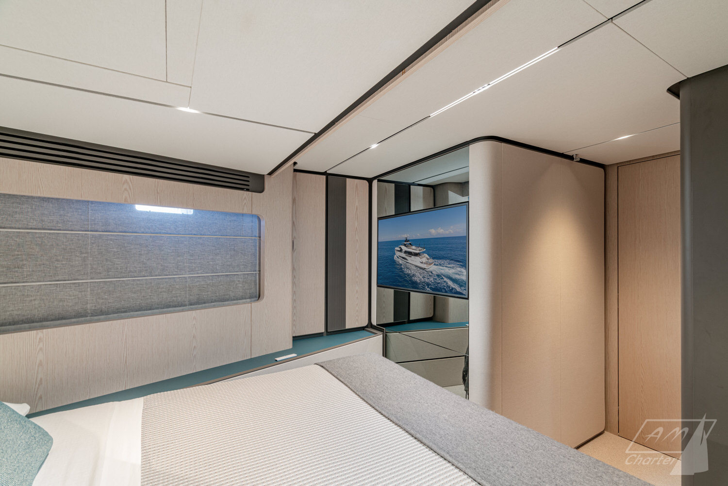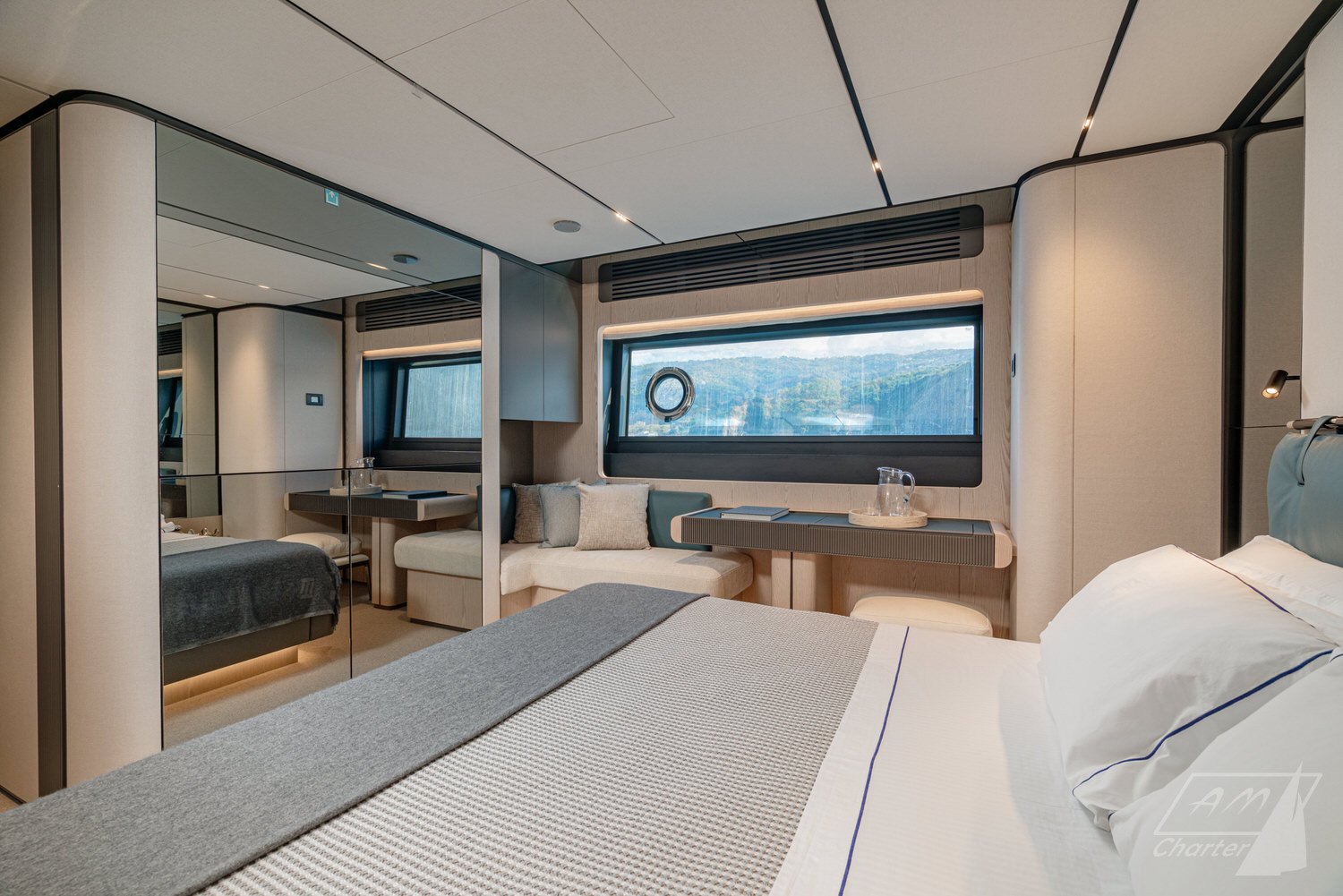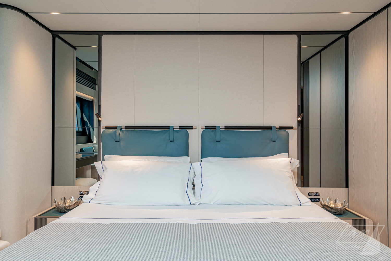Below deck, 4 large cabins, designed to ensure absolute privacy and relaxation. One of the cabins can be easily configured with single or double beds. Advanced stabilization systems, active both at sea and at anchor, reduce roll and fatigue, making every crossing smoother and anchor stops even more enjoyable. A professional crew of 4 people.