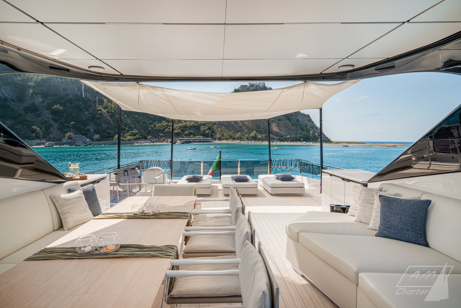 Welcome aboard the Ferretti INFYNITO 80 TRILOGY, a yacht designed for those who want to experience the sea in the open air, without sacrificing comfort. The iconic covered terrace, a true hallmark of the INFYNITO 80, extends harmoniously from the superstructure like a panoramic suite suspended over the sea: reserved, welcoming and with a breathtaking view.