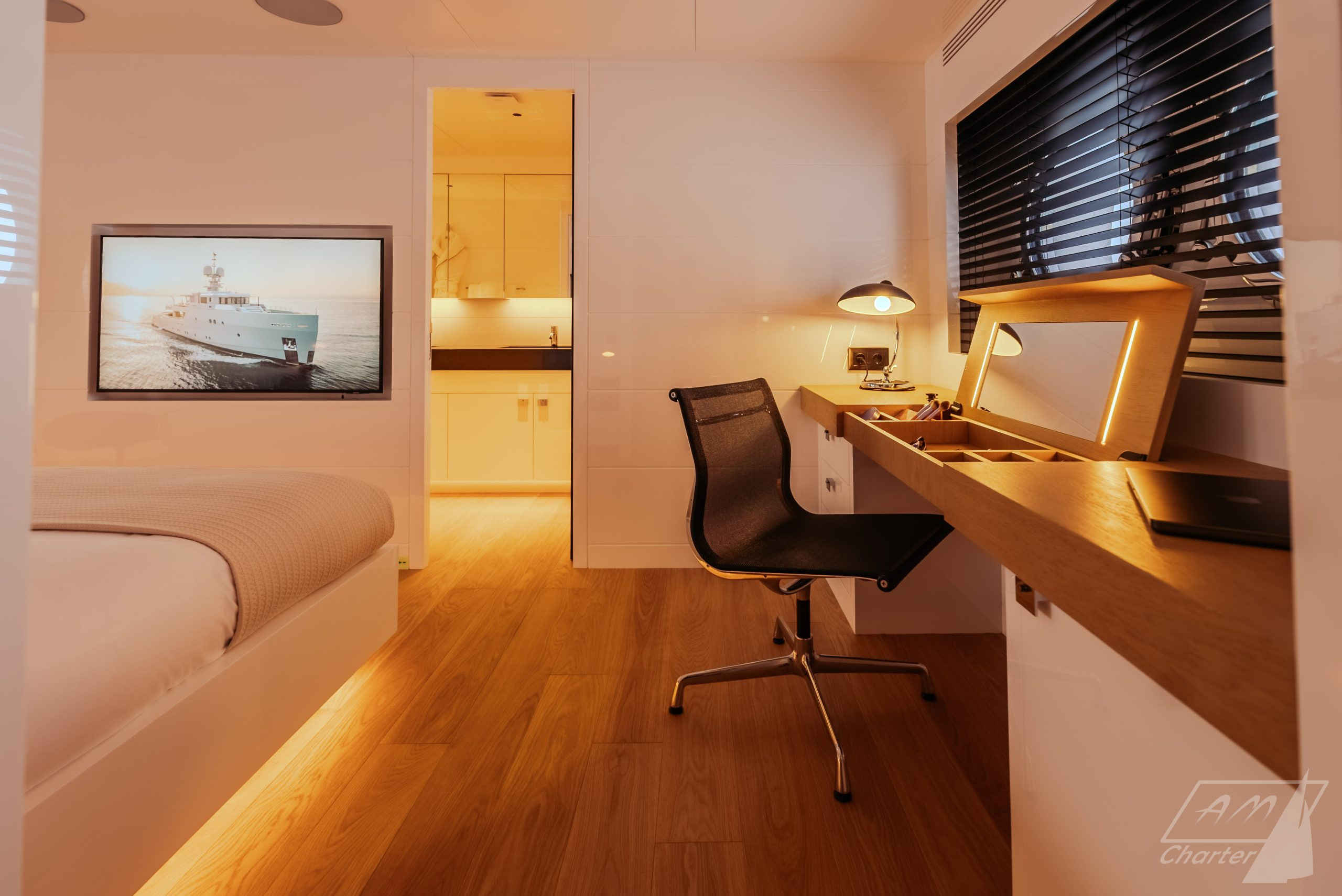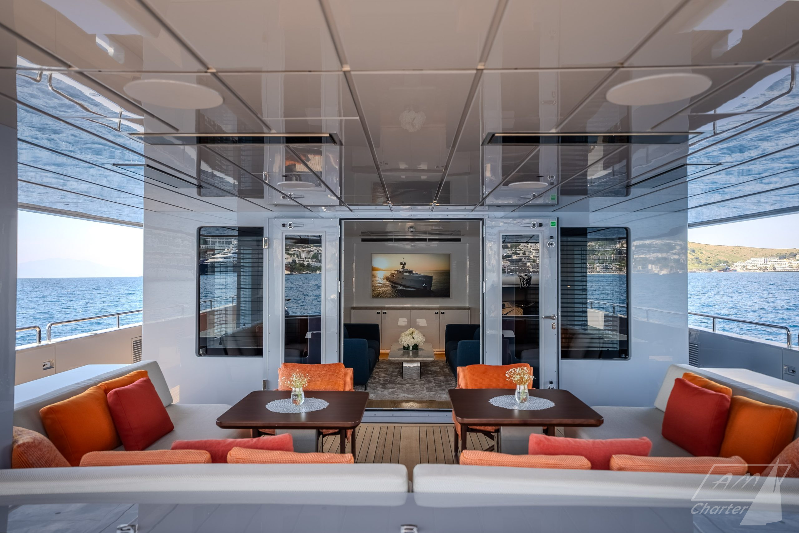 The beating heart of the MY Carmen Aegean Yachts Explorer M37 is the stunning sky lounge, which accommodates up to 10 people around an elegant dining table, offering breathtaking views of the sea.
